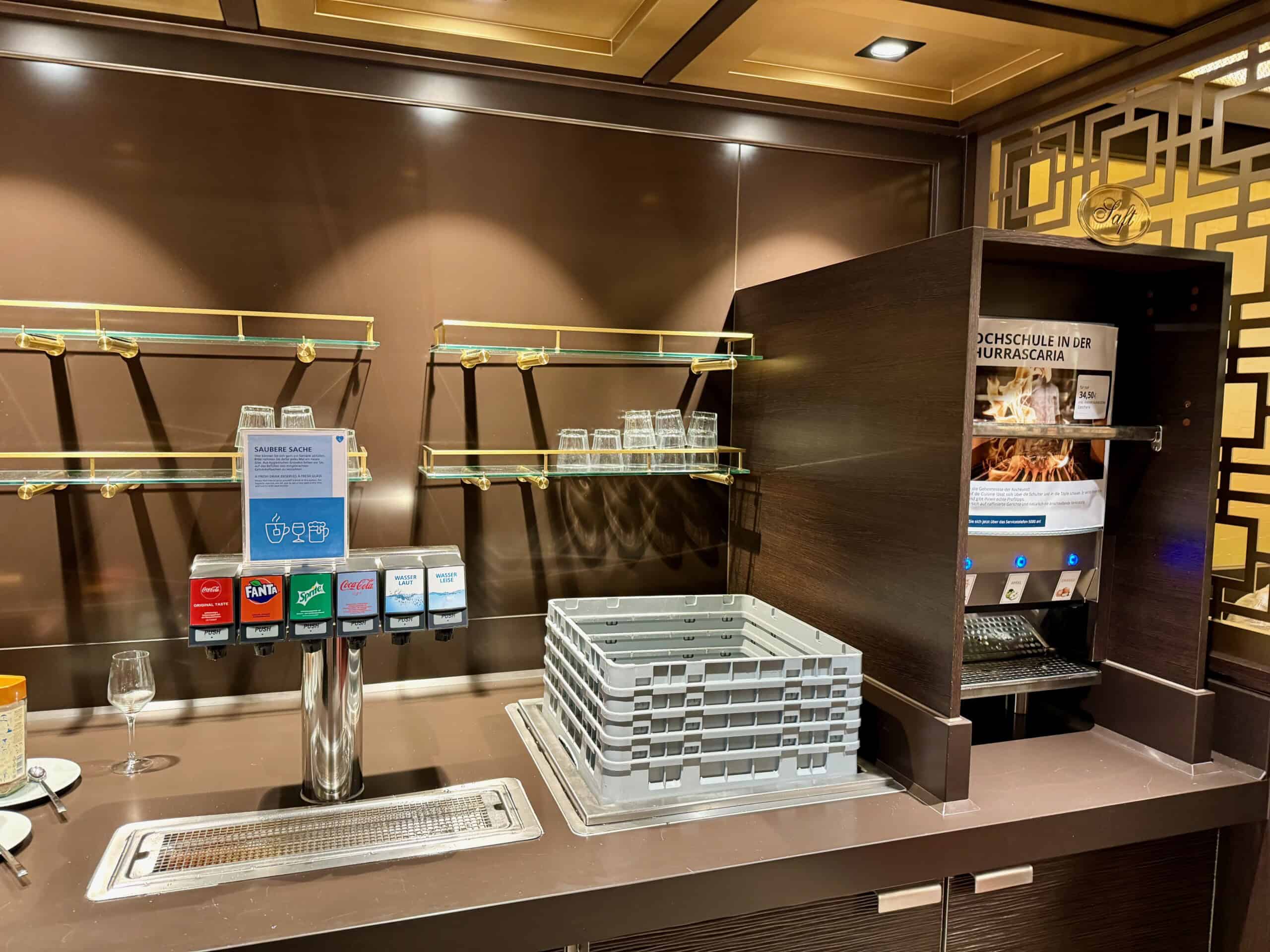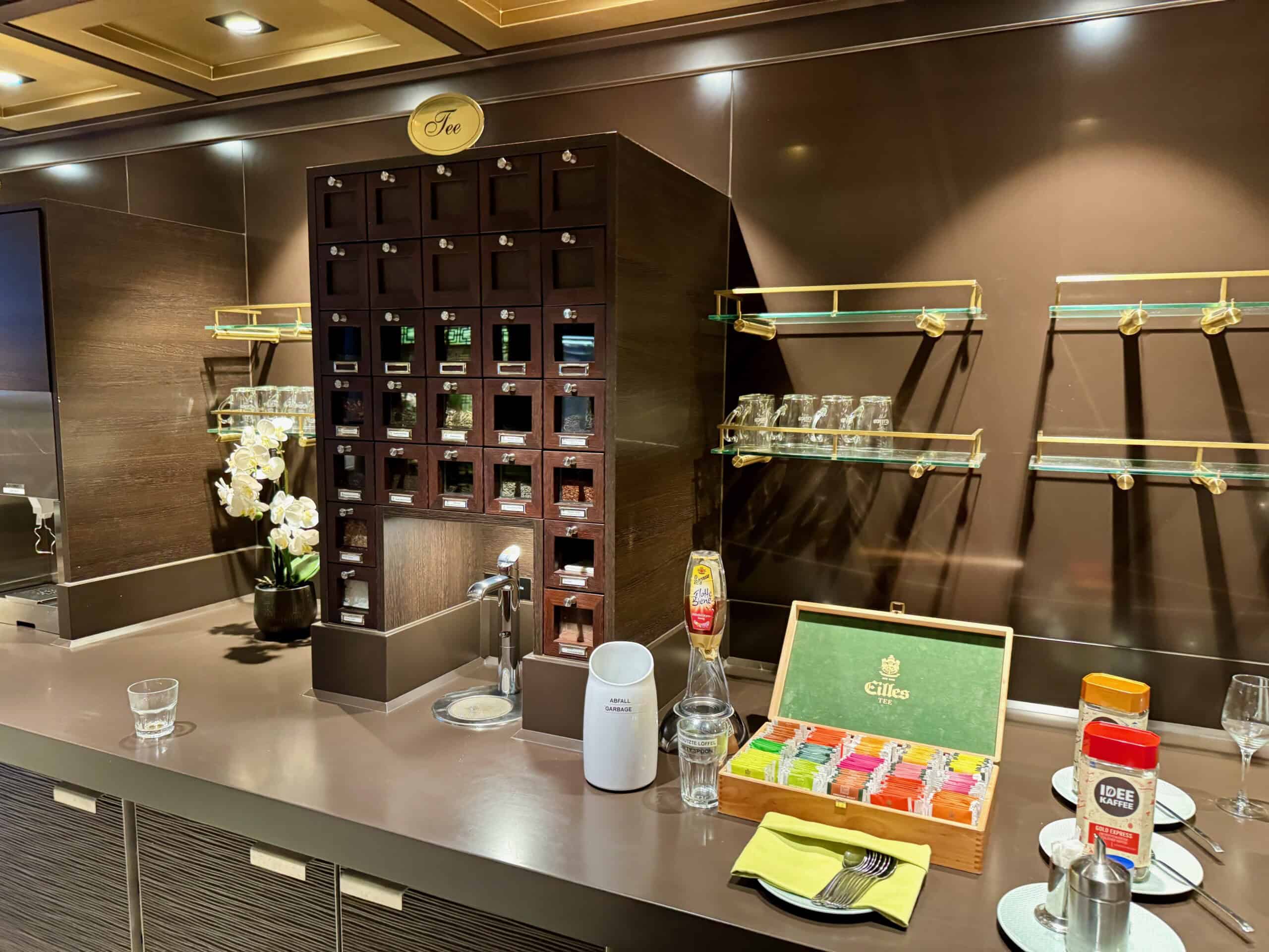 Beim Frühstück in den Buffet-Restaurants erhält man Filterkaffee am Platz und kann sich aus einer guten Auswahl an losem Tee bedienen. Zusätzlich gibt es meistens Säfte am Buffet. Je nach Restaurant stehen auch noch 1–2 Kaffeevollautomaten zur Verfügung, wo man mit der Bordkarte aber extra für bezahlen muss.
