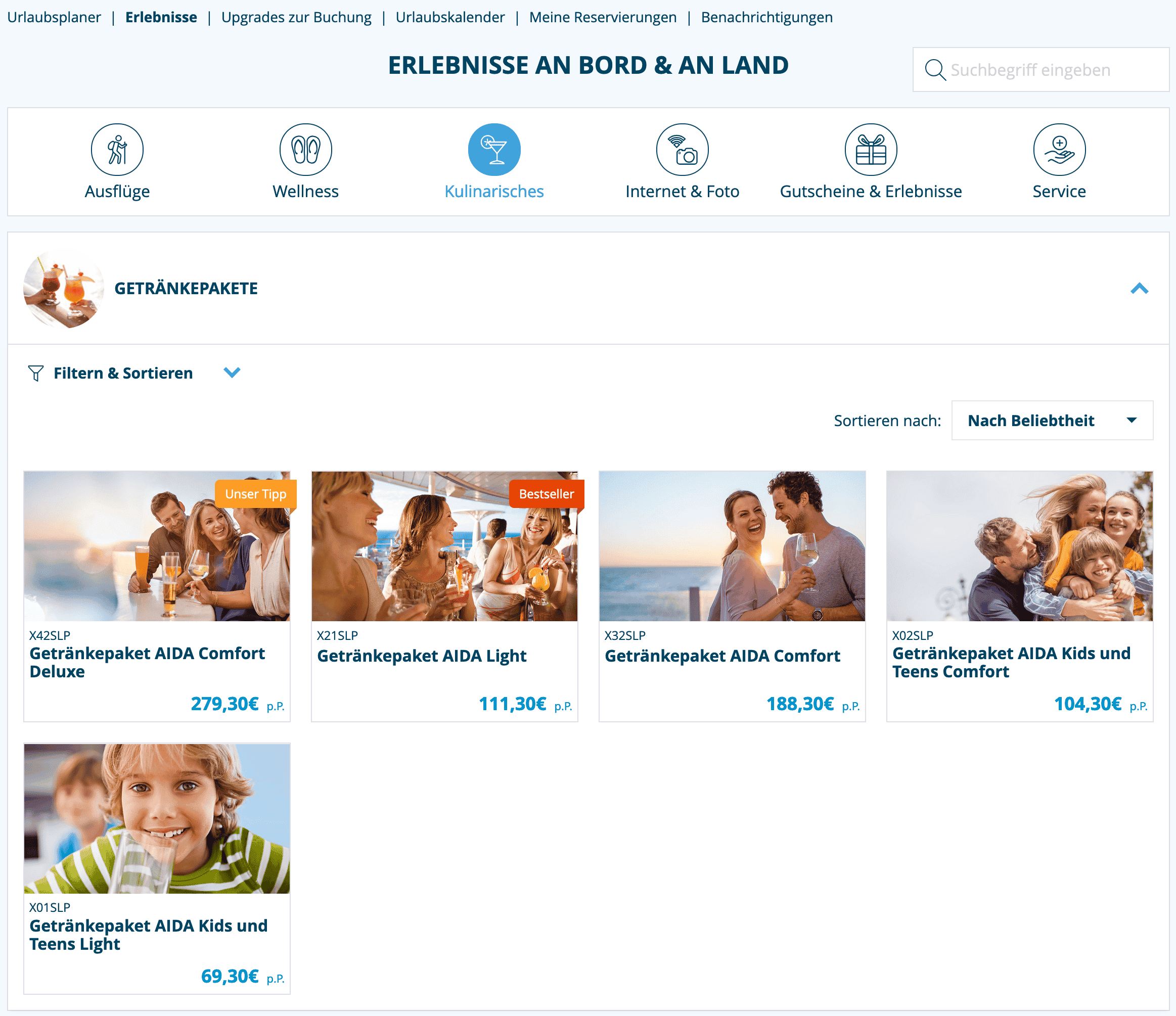 - Getränkepakete sind über myAIDA bis 3 Tage vor Anreise oder am Anreisetag und 1. vollen Tag an Bord buchbar
