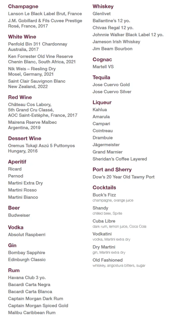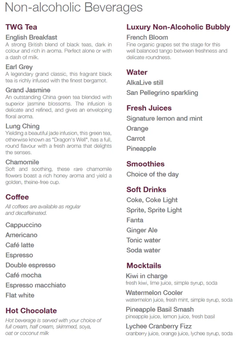 Auch bei der Auswahl an Getränken lässt sich Qatar Airways nicht lumpen. Nachfolgend die Getränkekarte: