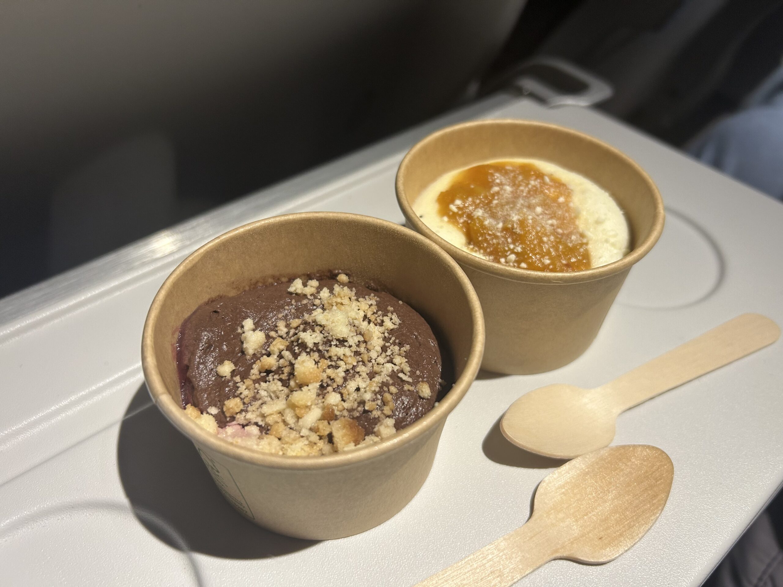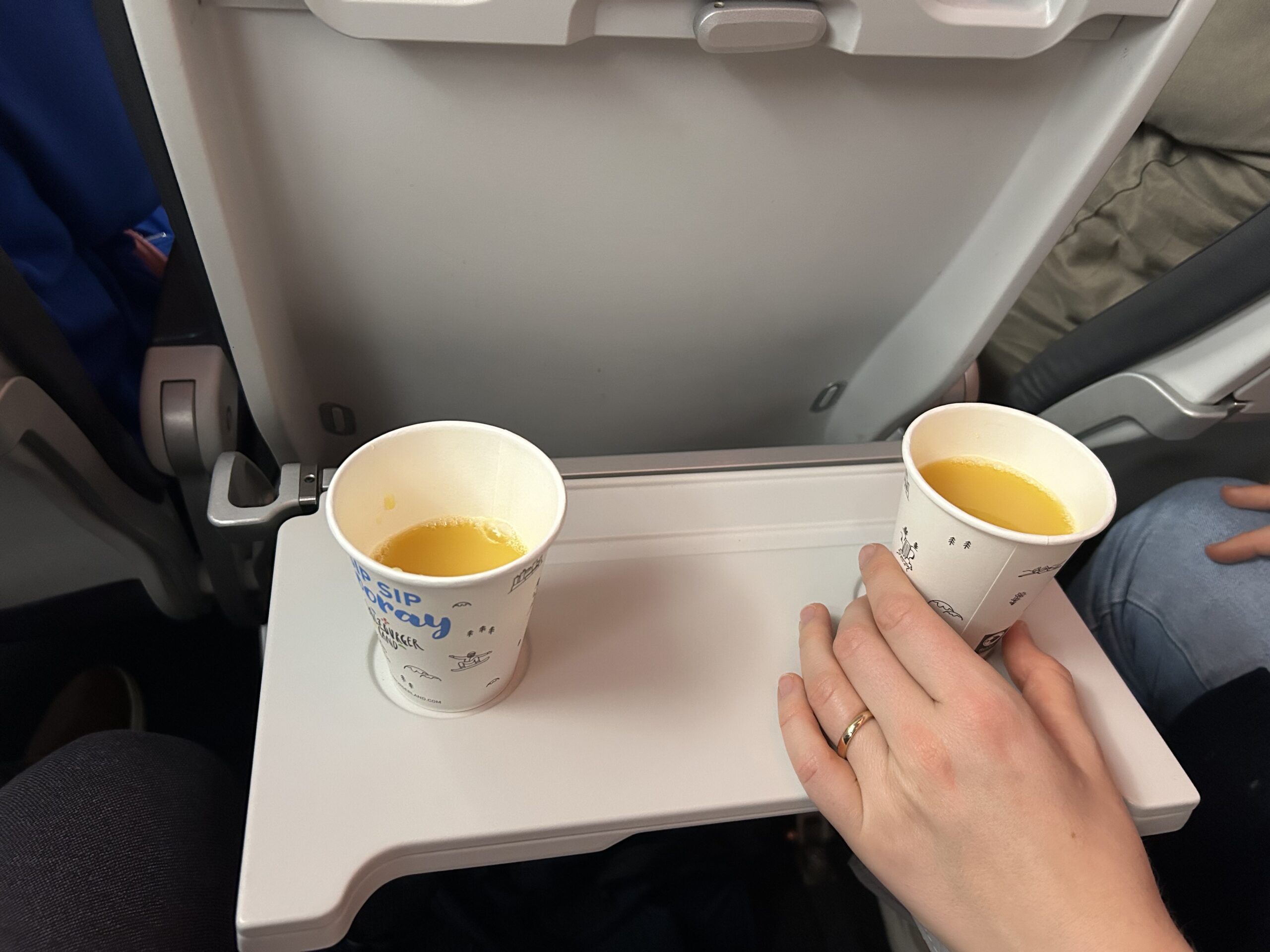 Der Flug von Köln begann – etwas überraschend – mit einem Willkommensgetränk vor dem Abflug. Man hatte die Wahl aus stillem Wasser oder Orangensaft aus Pappbechern. Nach dem Start wurde ein Frühstück serviert, mit der Wahl zwischen süß (Grießbrei mit Poffertjes und Beeren) oder herzhaft (Omelette mit Spinat und Rösti). Beide Varianten waren warm und durchschnittlich, wobei der Grießbrei ohne Beilagen durch seine künstliche Süße für mich ungenießbar war.