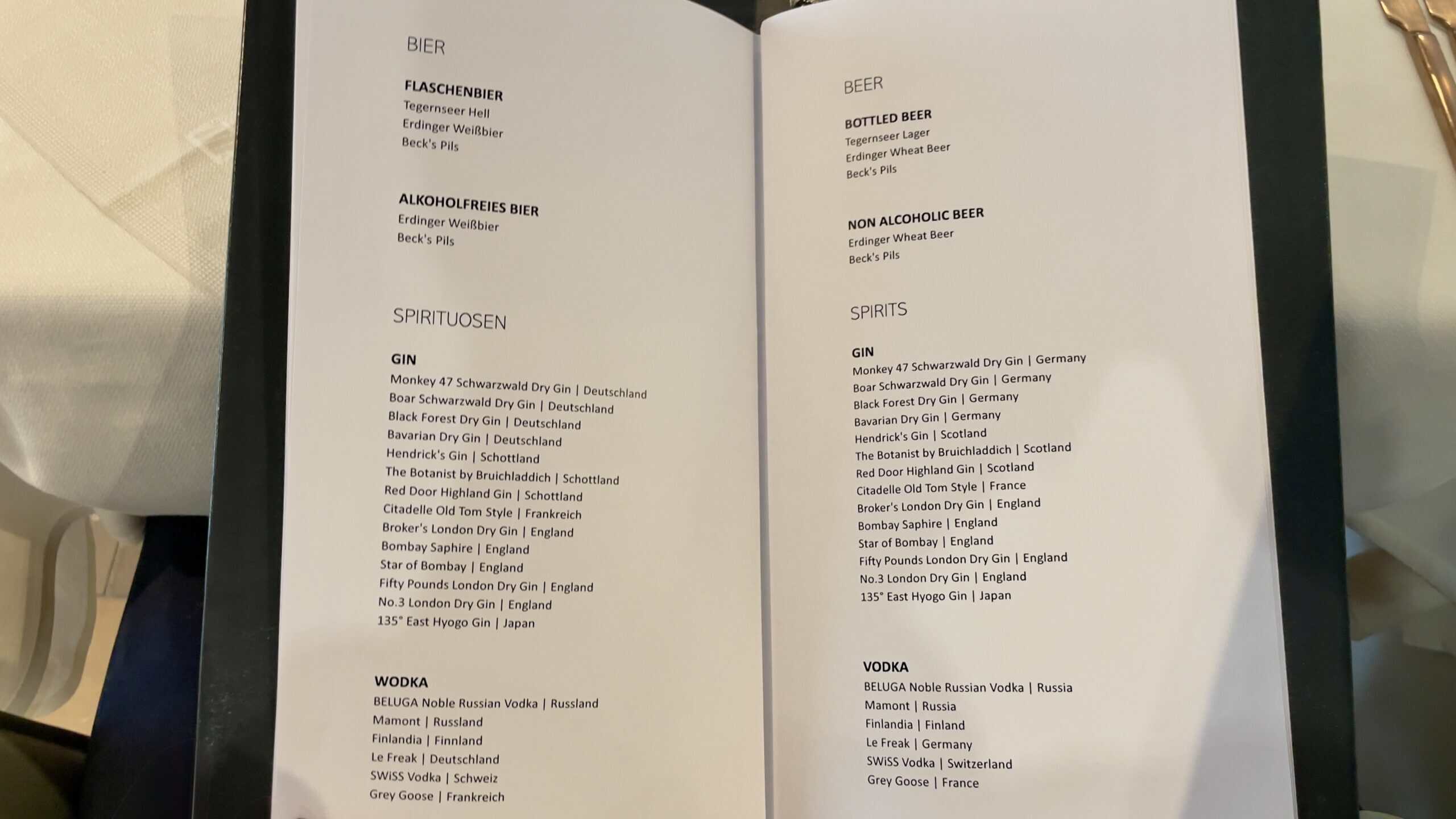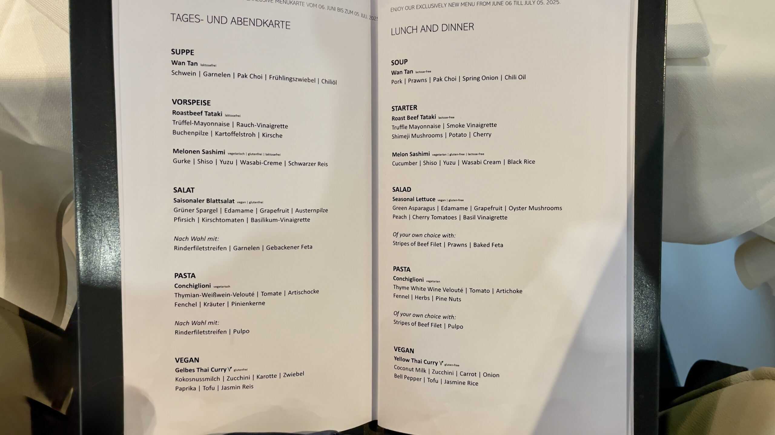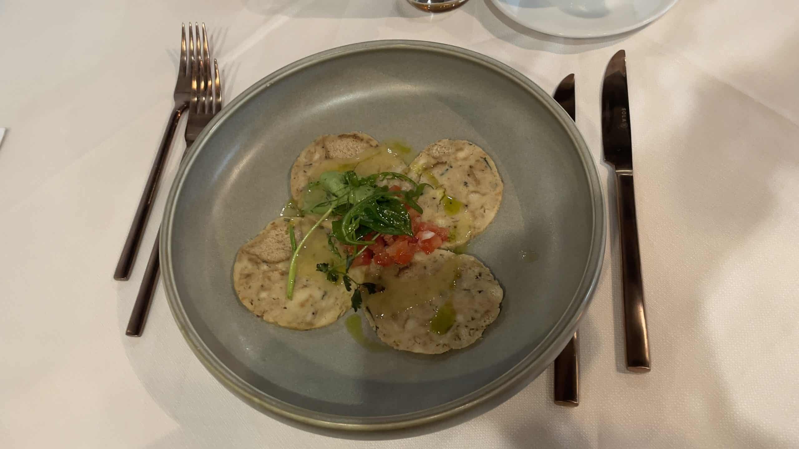 Zum Zeitpunkt meines Besuches war die Frühstückzeit bereits vorbei, sodass ich mich direkt der Auswahl an Speisen zum Mittag- und Abendessen zuwendete. Als Vorspeise entschied ich mich für ein „Bread Dumpling Carpaccio“ von der Sonderkarte, welche regelmäßig wechselt und während meines Aufenthaltes das Motto „Alpine Summer“ trug.