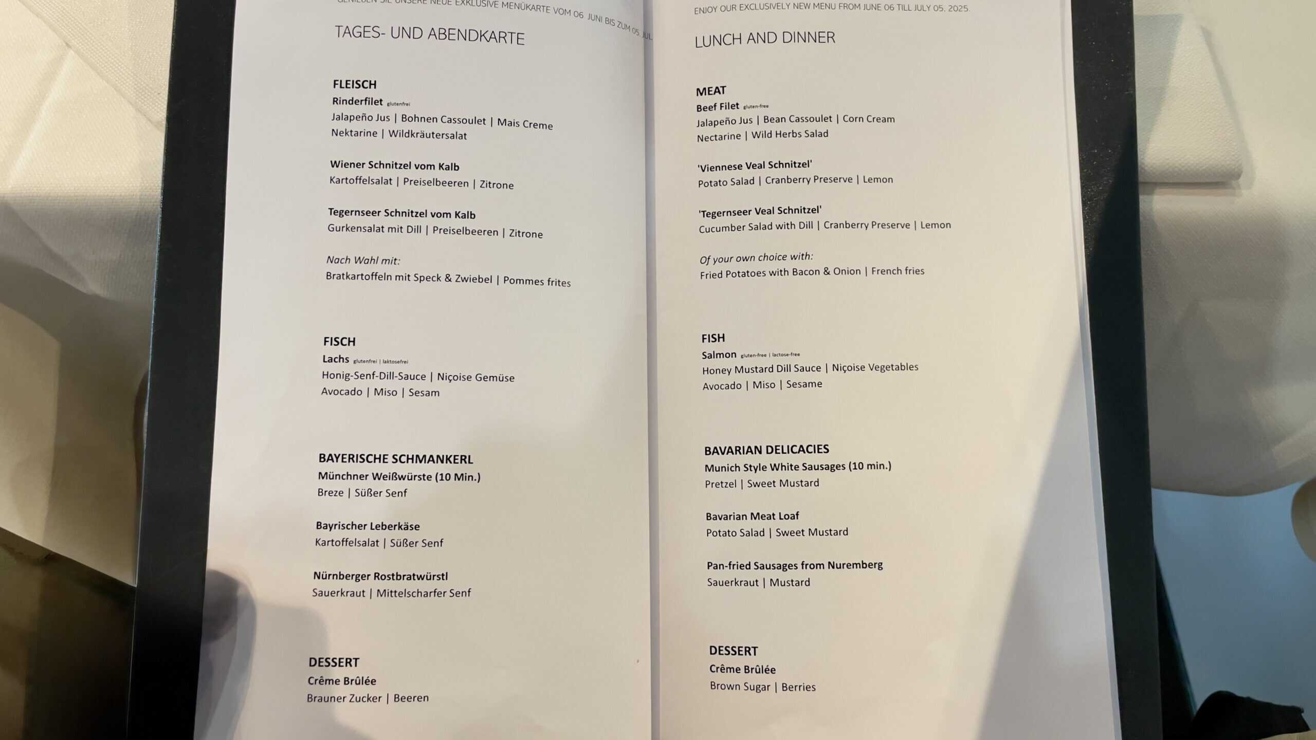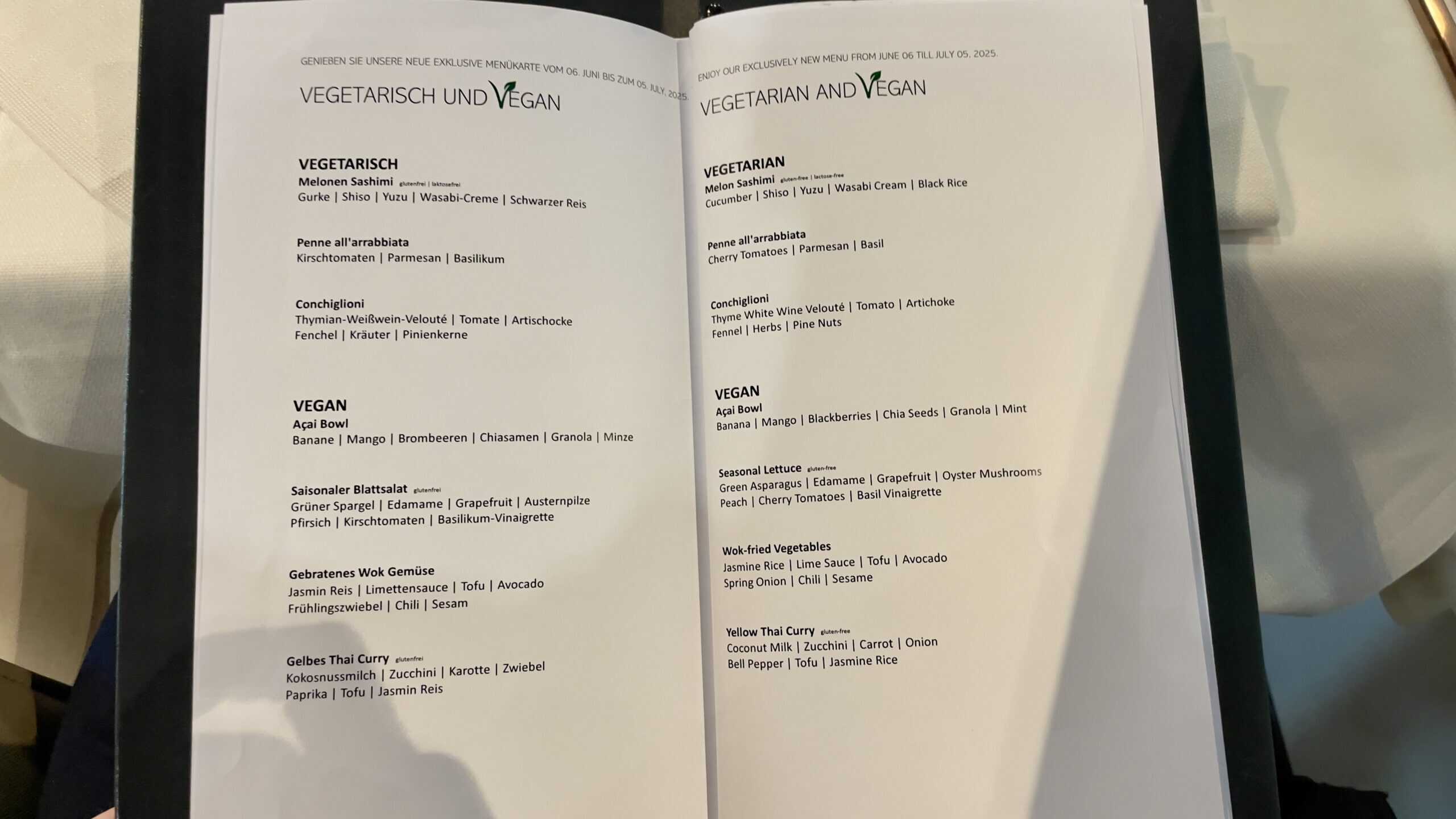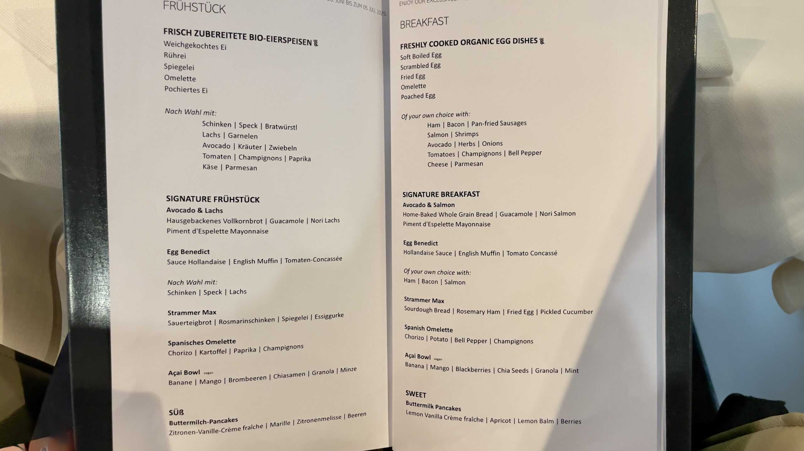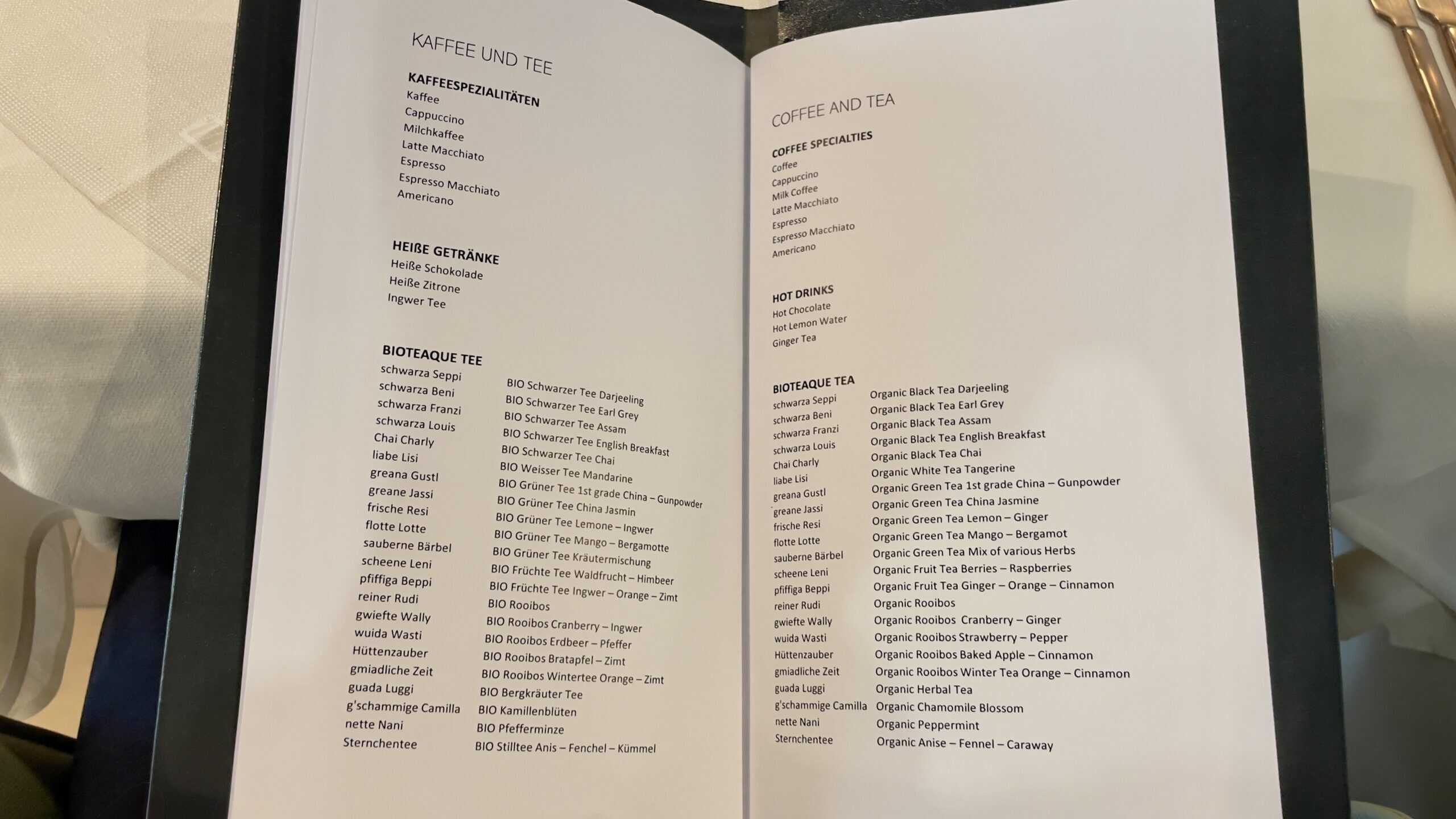 Zum Zeitpunkt meines Besuches war die Frühstückzeit bereits vorbei, sodass ich mich direkt der Auswahl an Speisen zum Mittag- und Abendessen zuwendete. Als Vorspeise entschied ich mich für ein „Bread Dumpling Carpaccio“ von der Sonderkarte, welche regelmäßig wechselt und während meines Aufenthaltes das Motto „Alpine Summer“ trug.