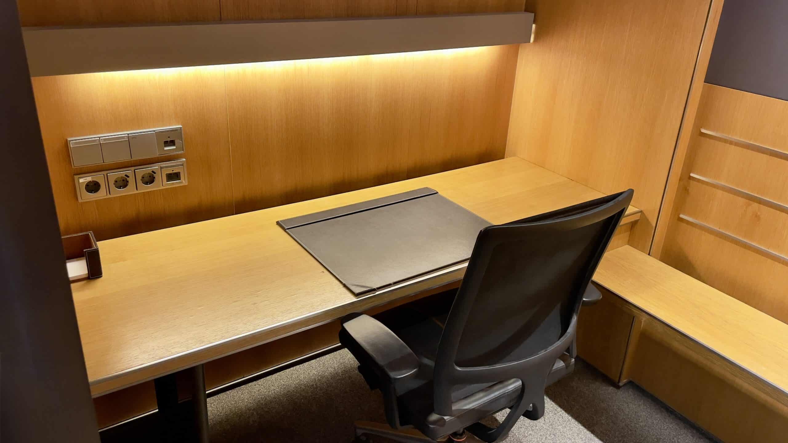 Wenn man dem Hauptgang der Lounge folgt, hat man auf der linken Seite nach dem Restaurantbereich vier geräumige Arbeitsräume. Diese verfügen neben einem Bürostuhl und entsprechender Beleuchtung auch über genügend Ablageflächen für sowohl Dokumente als auch Gepäck.