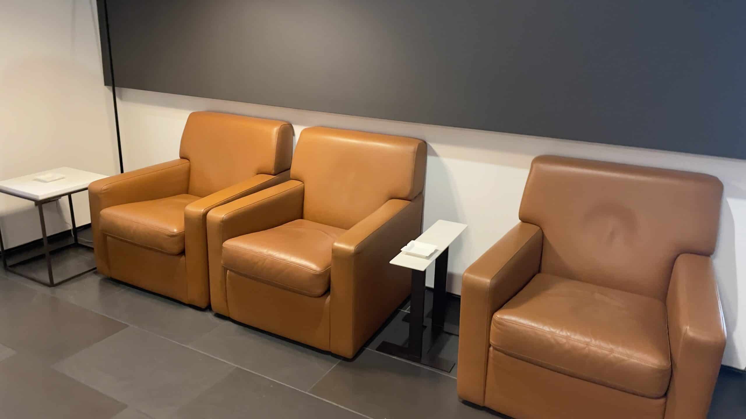 Auch Sessel mit dazugehörigen Fußhockern gibt es im hinteren Bereich der Lounge. Diese scheinen als eine von wenigen Möbeln aus der alten Lounge zu stammen und sind auch aus der Lounge im Satelliten-Terminal bekannt. Da es in der Lounge (anders als bei der im Satelliten-Terminal) keine Ruheräume gibt, sind diese zudem die „angenehmste“ Option, um ein kurzes Nickerchen zu halten. Bei längeren Aufenthalten in München empfiehlt es sich also, das Terminal und die Lounge zum Schlafen zu wechseln.