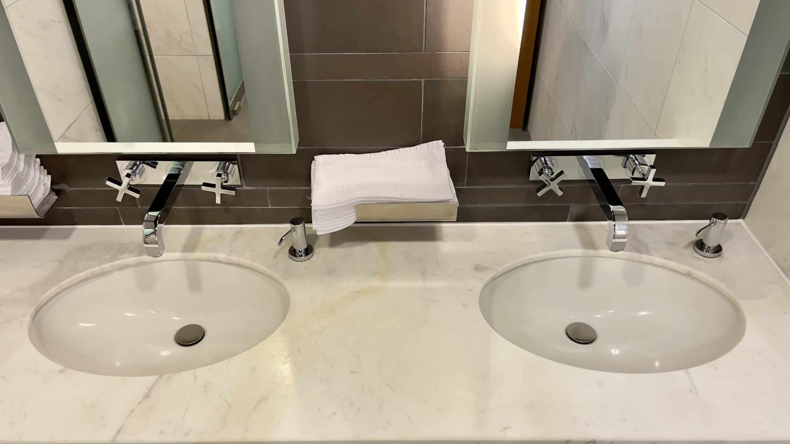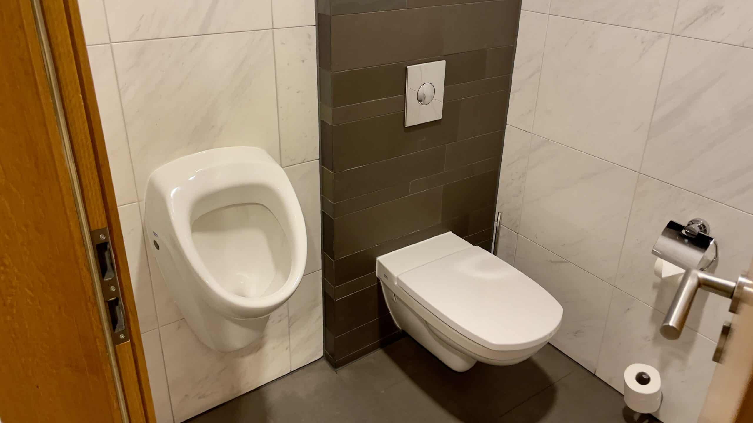 Wie in den Lufthansa First Class Lounges üblich, hat man(n) in den normalen/öffentlichen Sanitärbereichen Toilettenkabinen mit Pissoir und Toilette. Dadurch hat man immer seine Privatsphäre und lässt sein Gepäck nicht aus den Augen. Zum Abtrocknen gibt es Stoffhandtücher, welche in einem extra Korb gesammelt werden.