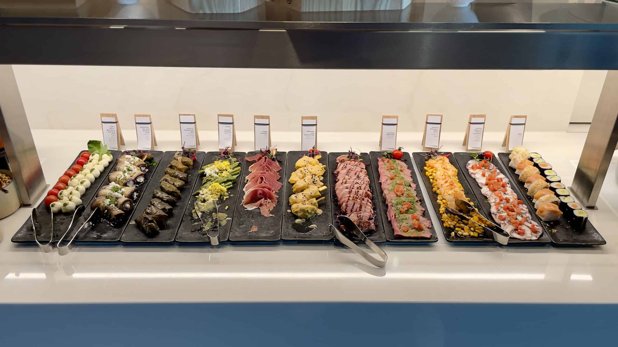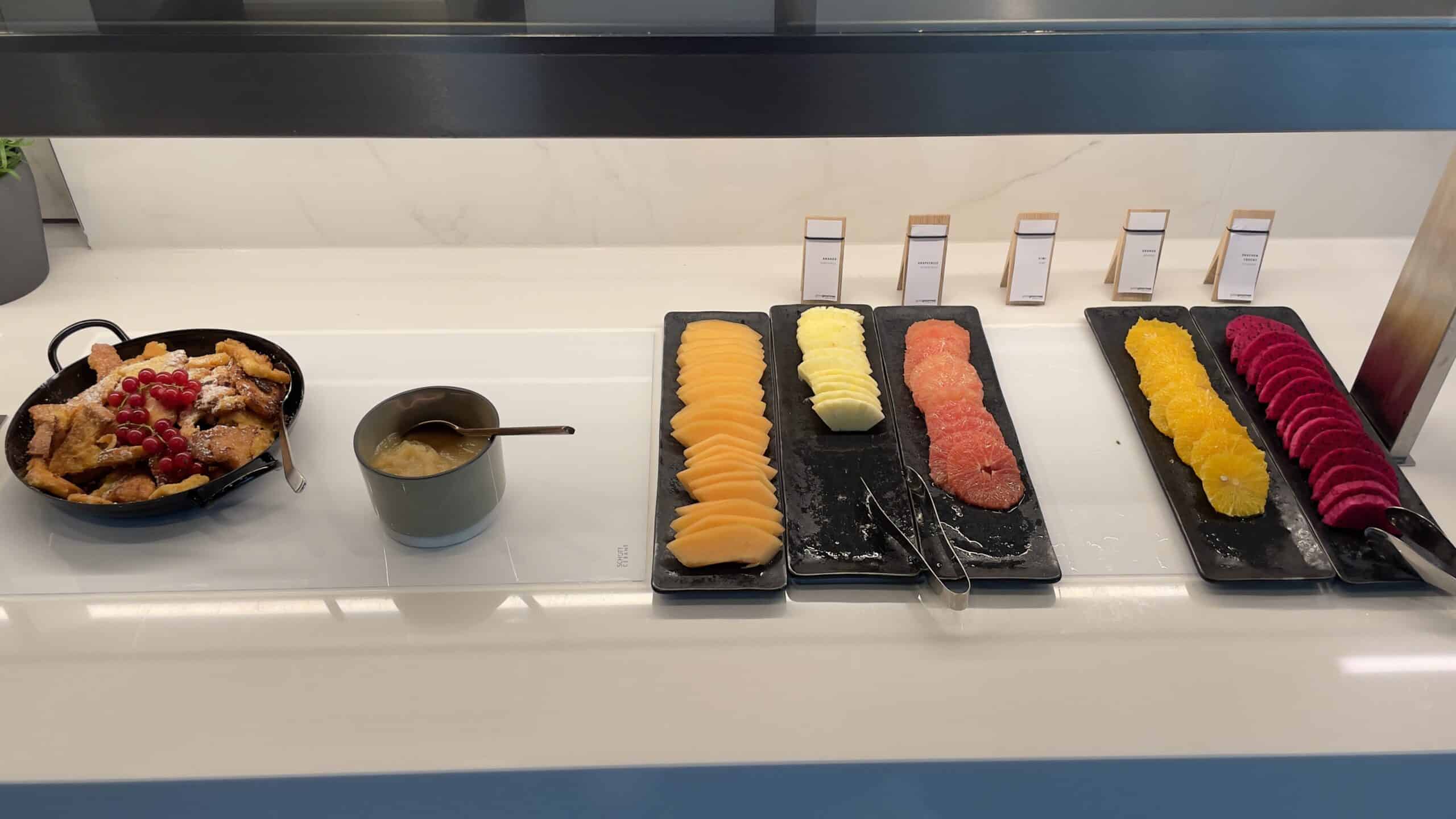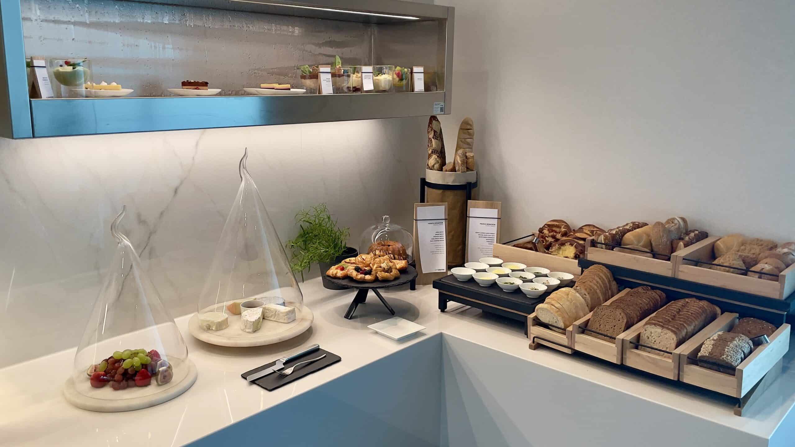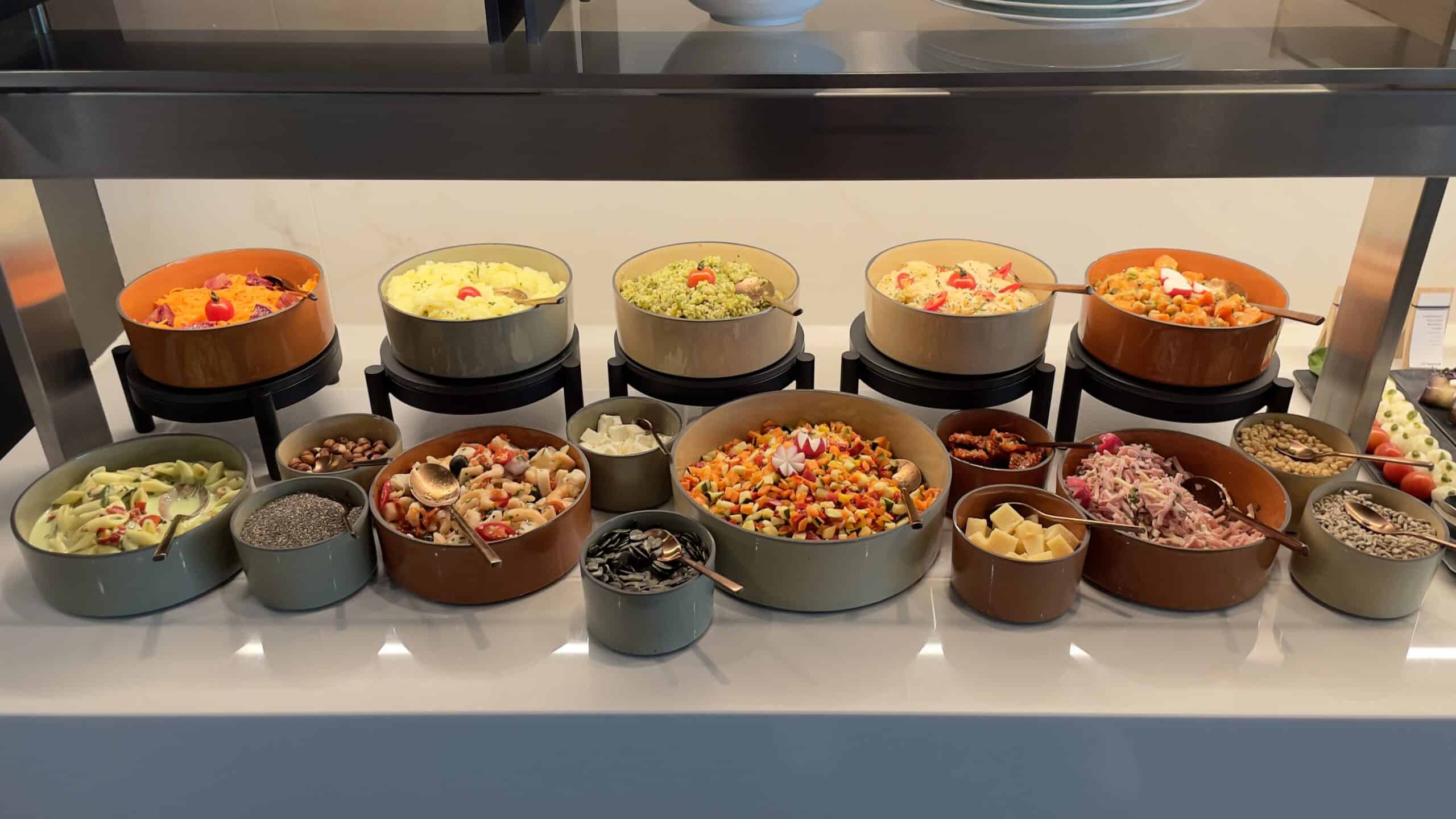 Die Sitzplätze an der Wand verfügen zudem über jeweils eine Steckdose. Das Buffet findet man auf der gegenüberliegenden Seite. Dieses fällt insgesamt etwas kleiner aus, als im Satelliten-Terminal, ließ jedoch keine größeren Wünsche offen. So gab es von Früchten über kalte und warme Speisen auch verschiedene Salate sowie Brote/Brötchen und Süßspeisen.