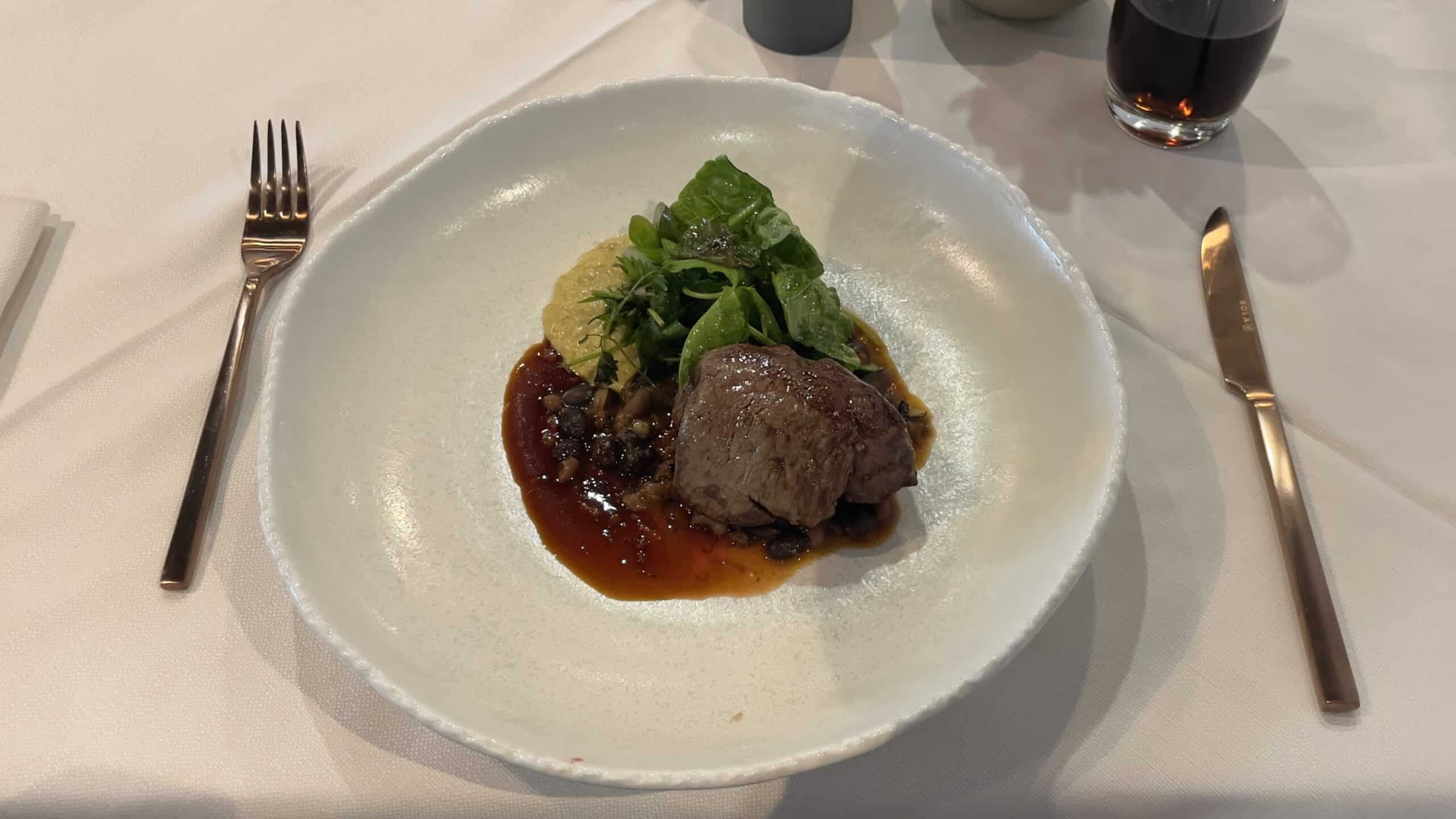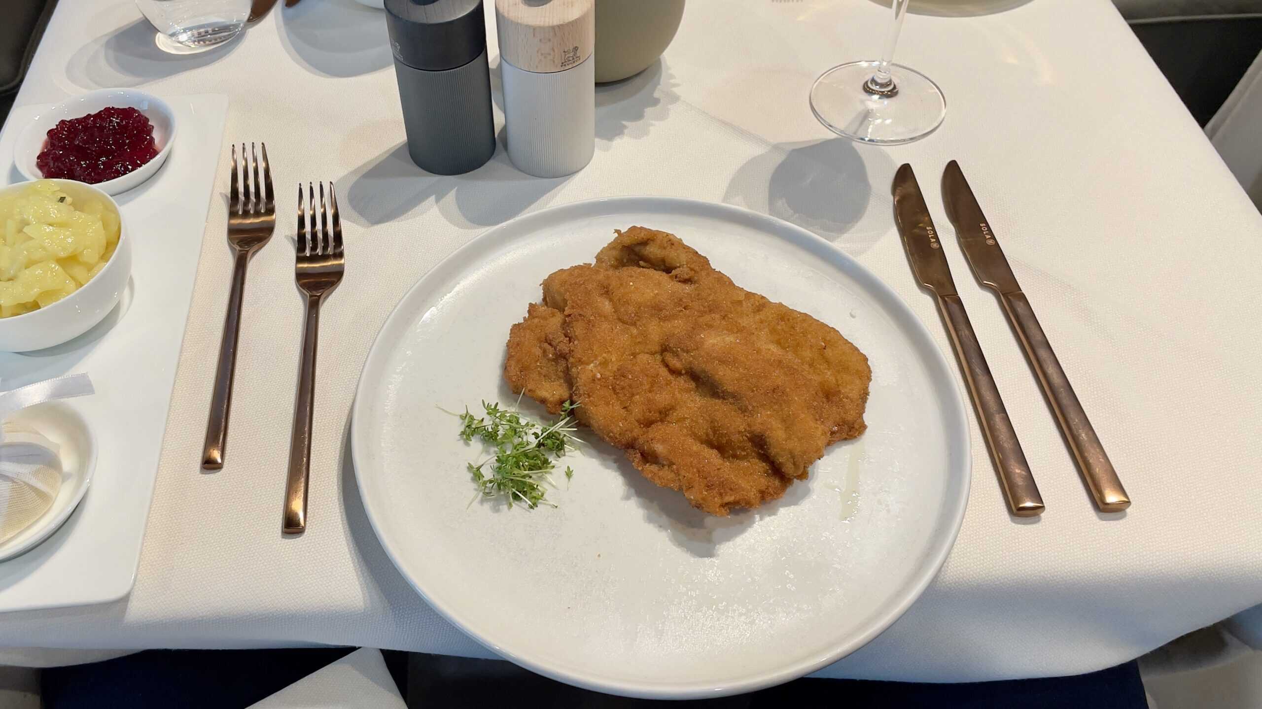 Im Anschluss gab es dann ein Rinderfilet mit Maiscreme und Jalapeño Jus, welches ebenfalls sehr lecker schmeckte. Anders als zum Beispiel in der Swiss First Class Lounge in Zürich war die Größe des Filets mit circa 200gr. ausreichend. Zumindest, wenn man im Anschluss noch Lust auf ein Wiener Schnitzel haben sollte.