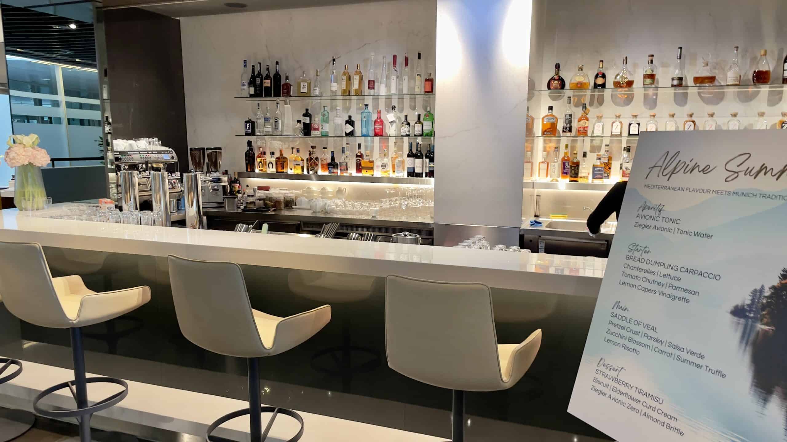 Die Bar ist auf jeden Fall schön geworden und bietet eine grundsätzlich gute Auswahl an Getränken. Man muss jedoch nach wie vor anmerken, dass die Qualität der Getränke bei anderen Airlines bzw. First Class Lounges noch einmal ein Stück besser ist. Trotzdem lassen sich nahezu alle Cocktails bestellen und es gibt verschiedene Champagner zur Auswahl.