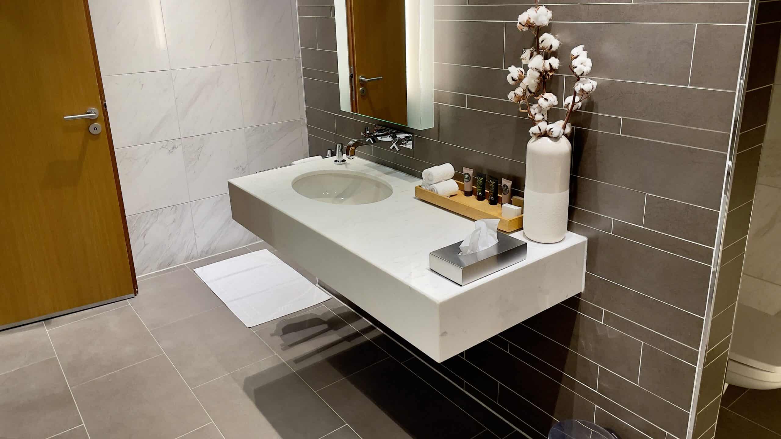 Hinter den Arbeitsräumen führt ein Gang links zu den Toiletten sowie Duschen und der Badewanne. Letztere gibt es genauso wie auch im FCT oder Satelliten-Terminal in einer der Badezimmer, sollte einem nach einem ausgiebigen Bad sein. Ansonsten unterscheiden sich die Sanitäranlagen nicht weiter von denen anderer Lufthansa First Class Lounges.