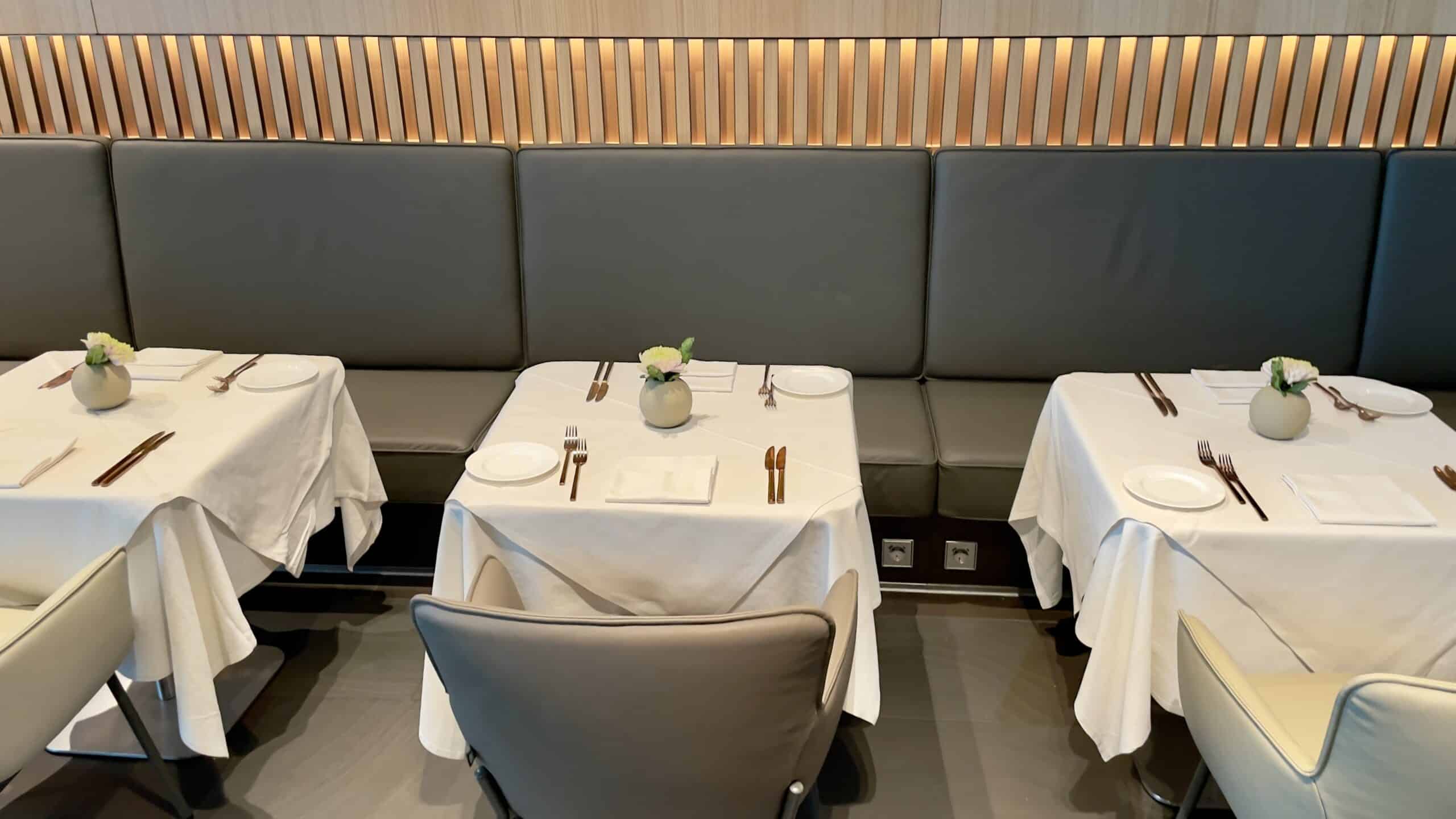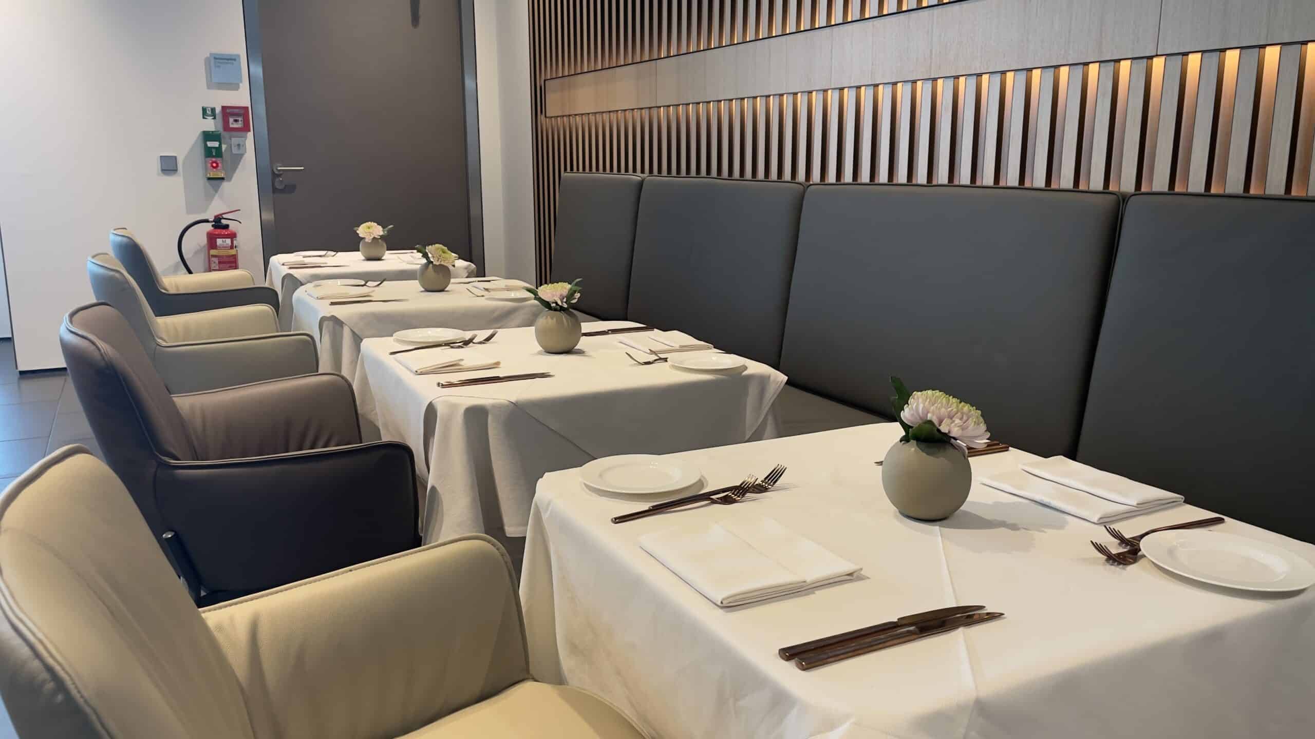 So findet man viele braune und creme Farbtöne durch die Lounge hinweg verteilt. Eine Anspielung an das neueste Allegris First Class Produkt lässt sich lediglich im Restaurantbereich bei den Wandpaneelen entdecken. Diese ähneln dann doch stark der Außenwand der Allegris-First-Suiten.