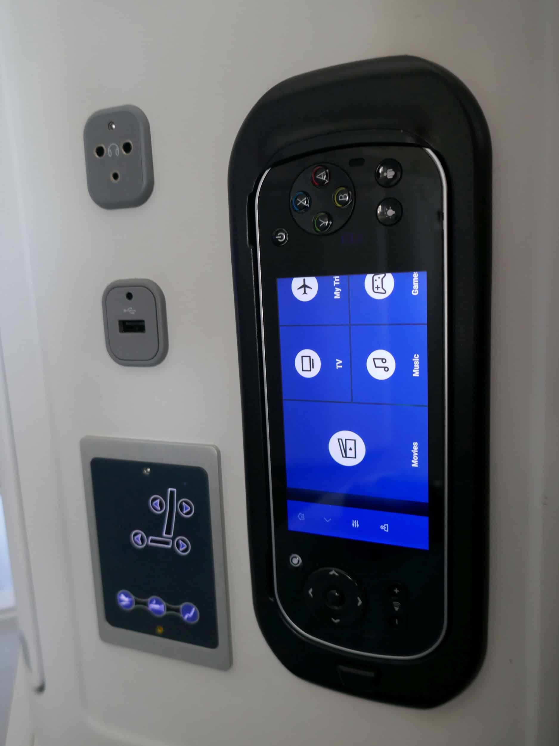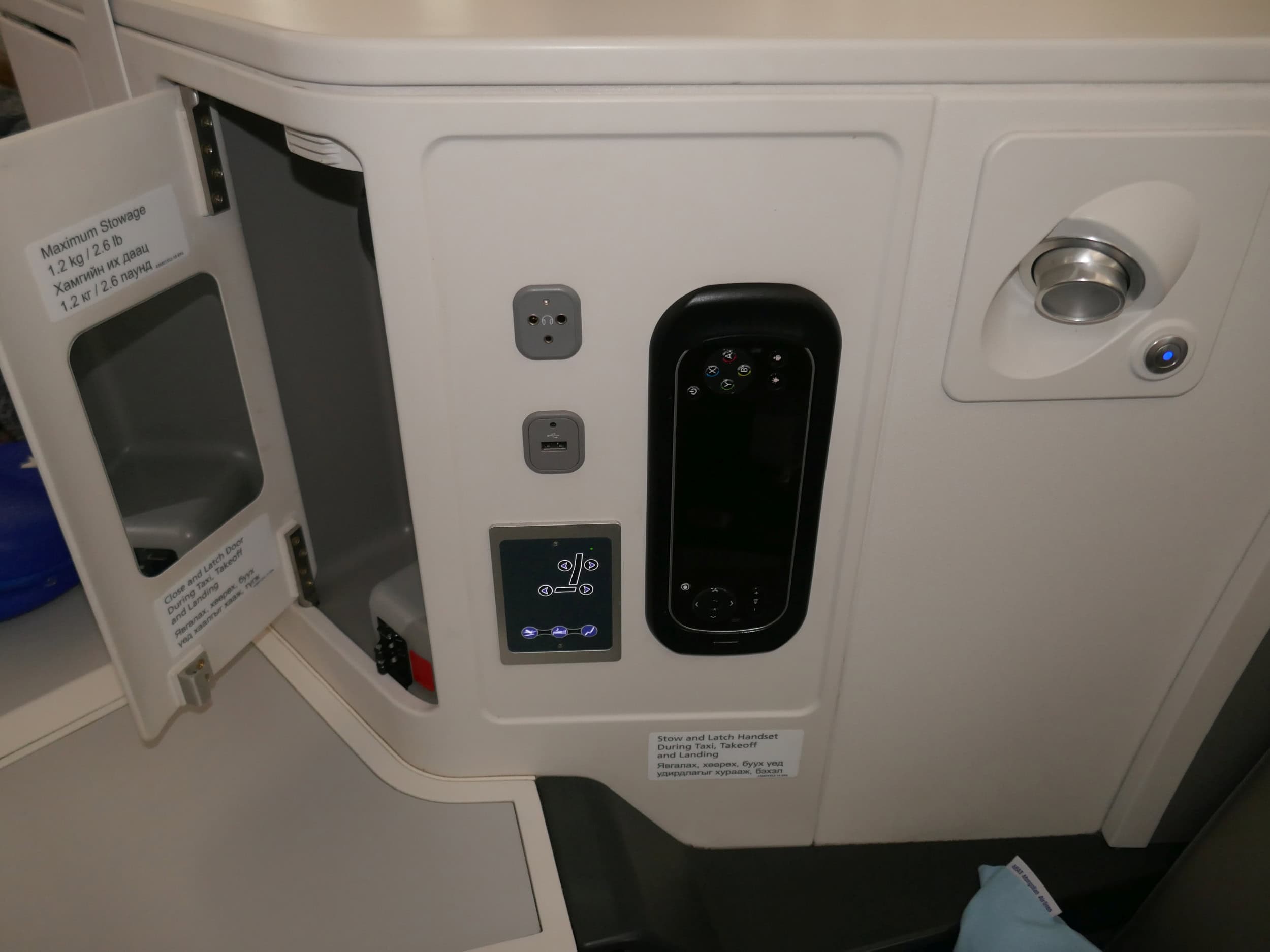 An den Sitzen gibt es in der Mittelkonsole ein kleines Ablagefach mit Spiegel, die Fernbedienung für das IFE und eine kleine Leselampe. Bei den Fenstersitzen ist das Ablagefach offen und es gibt auch keinen Spiegel. Am Gang gibt es noch ein weiteres Ablagefach. Unter der Mittelarmlehne ist noch Platz für eine Flasche Wasser, die sich bereits dort befand. Und die Lehne zum Gang ist natürlich vollständig versenkbar. Unter der Fußablage befindet sich ebenfalls noch genügend Stauraum für Schuhe oder einen kleinen Rucksack. Ein USB-A Anschluss und eine Universalsteckdose sind ebenfalls am Sitz vorhanden.