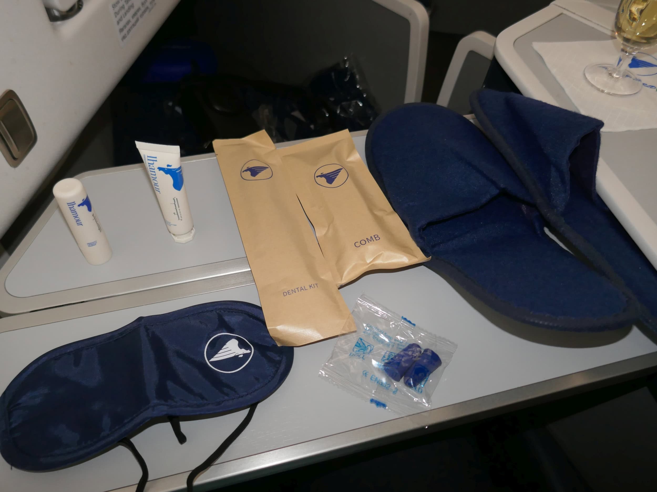 Das Amenity Kit in Form einer Waschtasche war inhaltlich sehr einfach und unspektakulär. Gute Ohrstöpsel, eine zu enge Schlafmaske, ein Kamm, Zahnbürste mit Colgate Zahnpasta, Slipper, ein Lippenbalsam und eine Handcreme, die unerwartet interessant riecht. Ich habe ehrlicherweise Socken vermisst. Ein Pyjama oder Schlafshirt wird bei MIAT nicht angeboten.