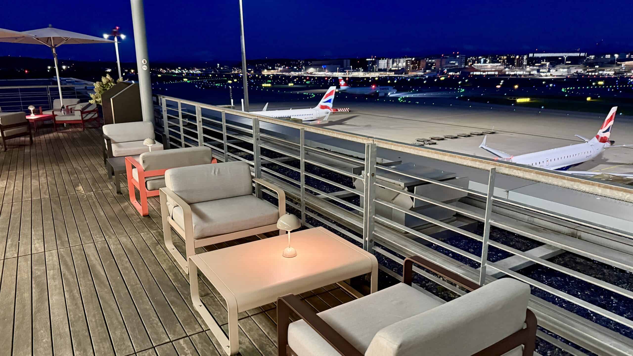 Neben der Aussicht gibt es noch ein weiteres Highlight, das alle Lounges im Satelliten-Terminal miteinander gemein haben: die Terrasse. Im Falle der Swiss First Class Lounge ist diese jedoch besonders großzügig gestaltet und bietet eine 180-Grad-Aussicht auf den östlichen Teil des Vorfeldes. Insbesondere im Sommer lässt es sich hier hervorragend aushalten.