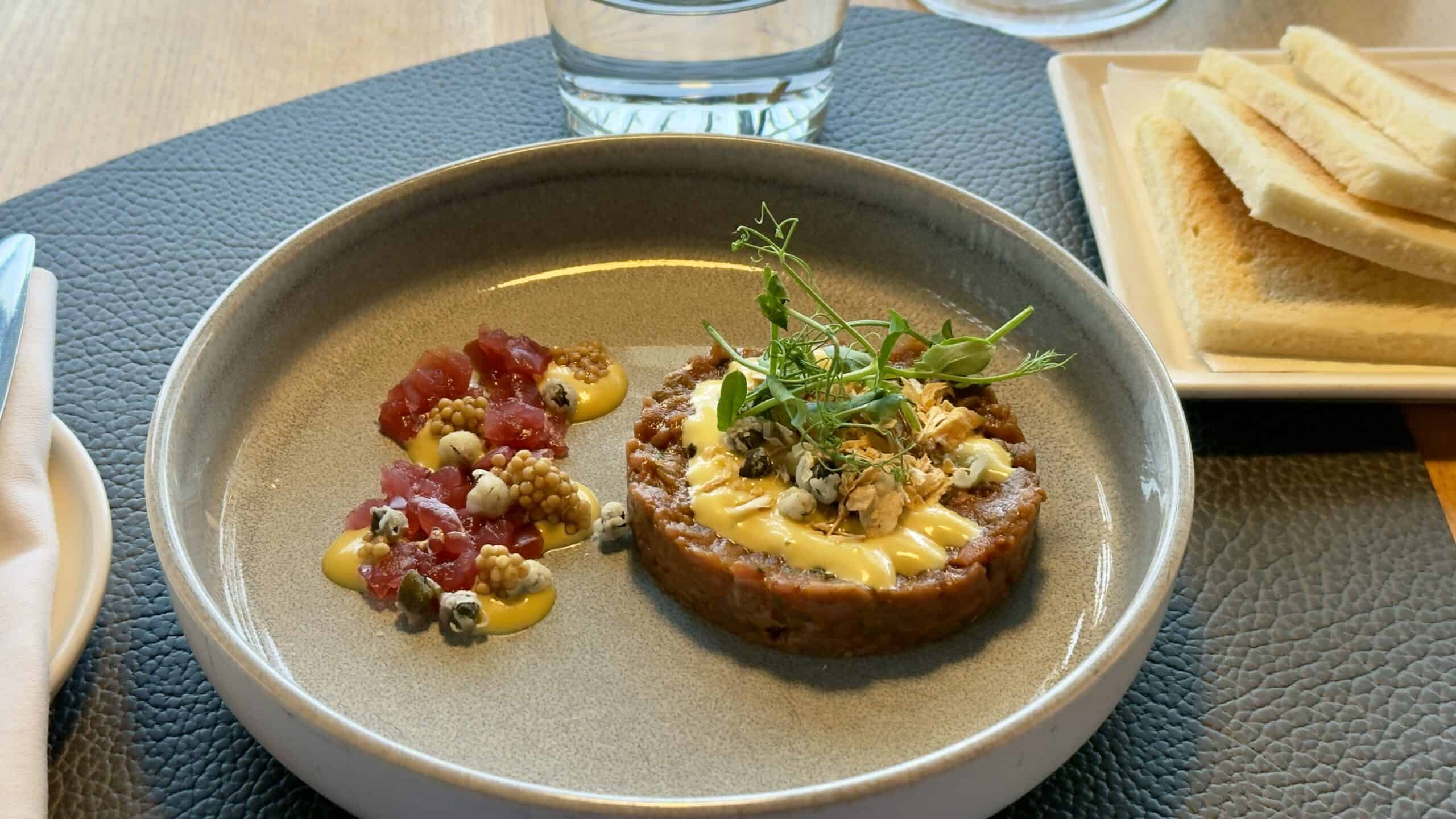 Den Anpassungen der Karte war dabei zunächst auch das wohl ikonischste Gericht der Karte, das Käse-Fondue, zum Opfer gefallen. Mittlerweile gibt es das Fondue jedoch wieder, hoffentlich nun wieder dauerhaft. Auch wenn dies die Geruchskulisse der Lounge sicherlich verbessert, finde ich dies durchaus schade, nachdem wohl kein Gericht die Schweiz mehr verkörpert hat. Glücklicherweise gibt es jedoch weiterhin ein Rindstartar, welches zudem auch durch eine vegetarische Option ersetzt werden kann.