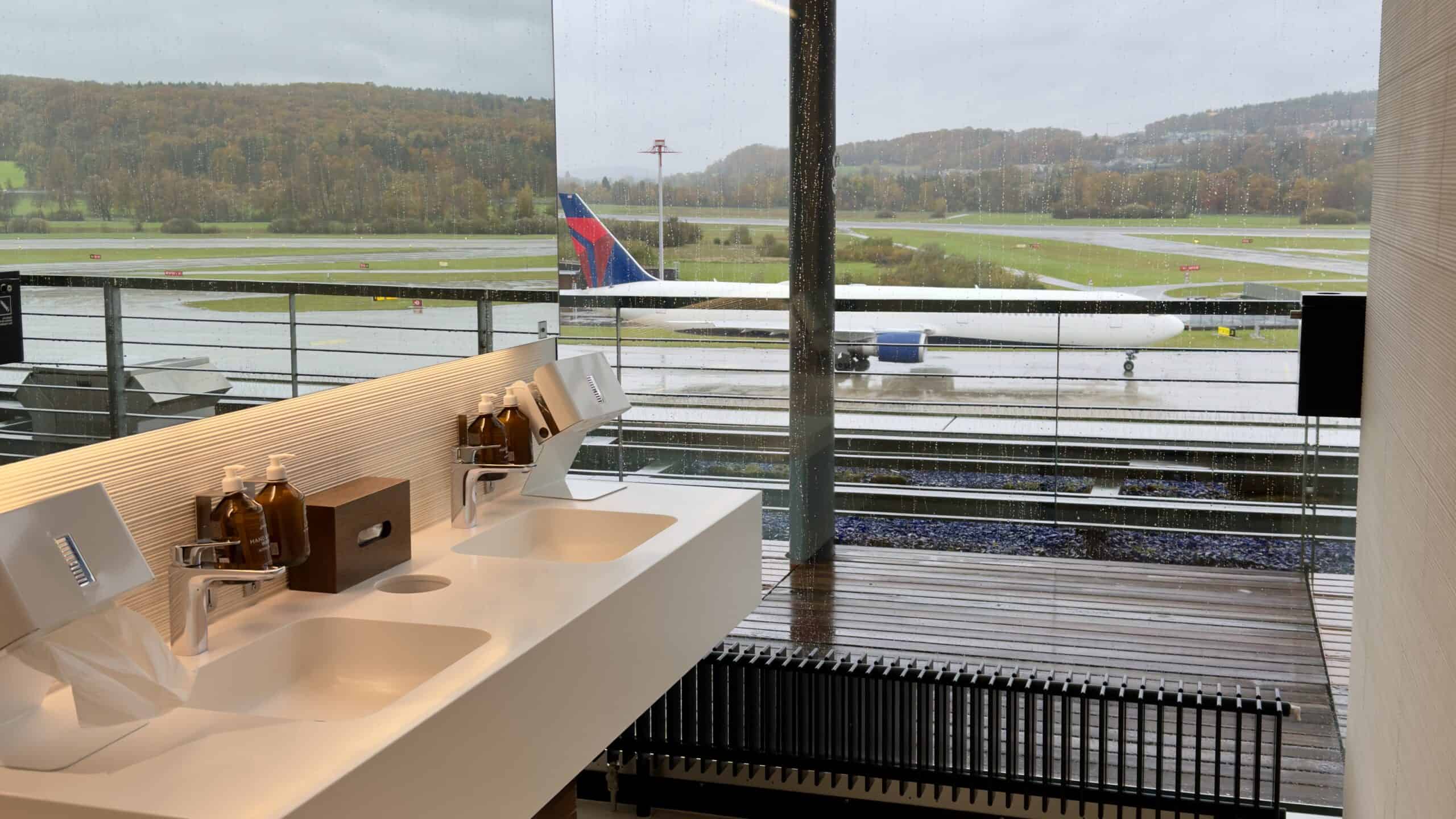 Auf der anderen Seite des Empfangs befinden sich die Toiletten, Duschen und zwei Schlafzimmer. Dabei sind die Duschräume die wohl unspektakulärsten aller First Class Lounges, die ich bisher erlebt habe, und unterscheiden sich meiner Erfahrung nach nicht wirklich von denen der Business/Senator Lounge. Dafür ist der Ausblick aus den Toiletten (bzw. deren Waschräumen) ebenfalls sehr faszinierend.