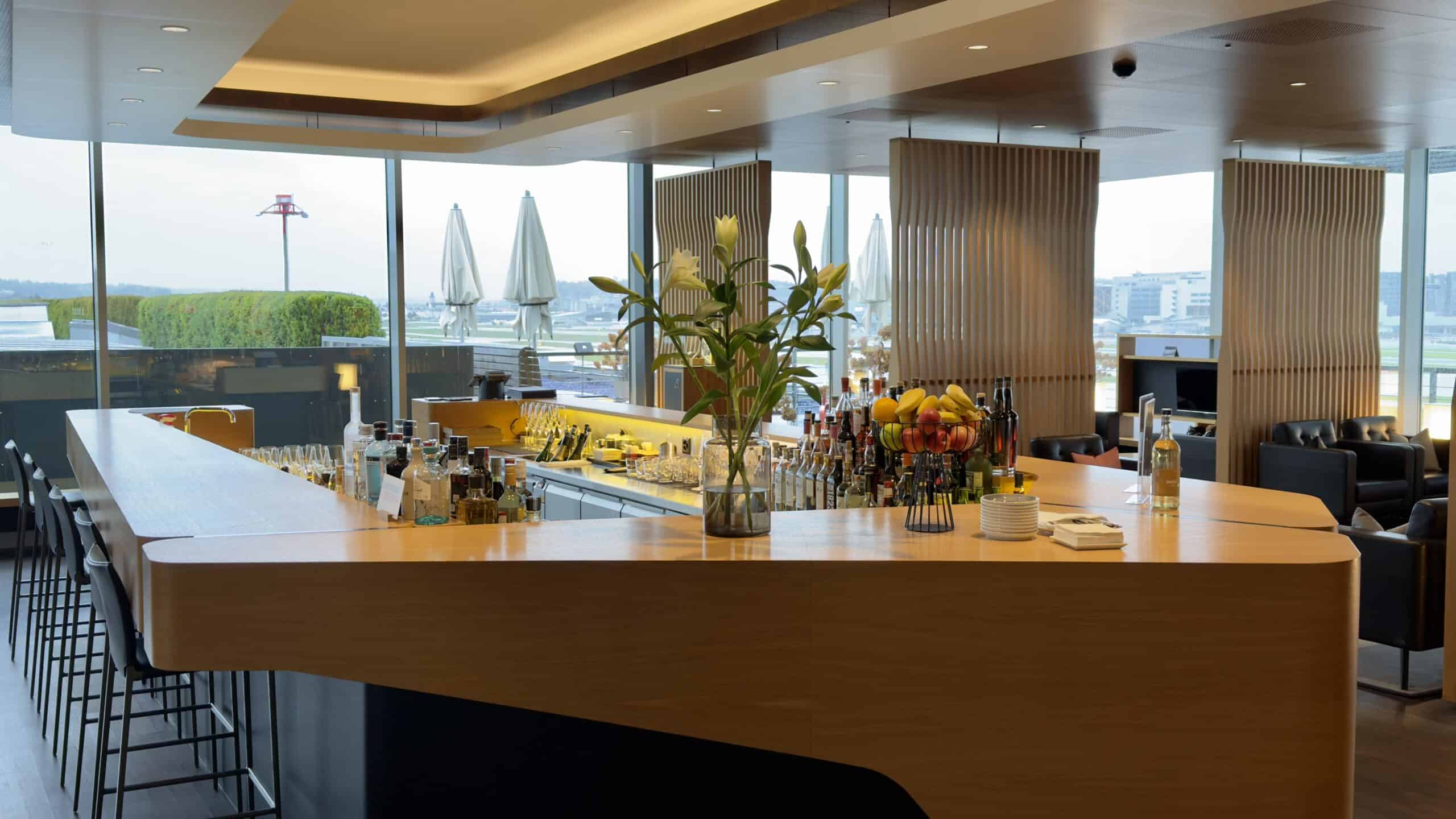 Wenn man die Swiss First Class Lounge bei den E-Gates betritt, fällt einem zunächst einmal der lichtdurchflutete und ringsum verglaste Hauptraum inklusive der Bar auf. Basierend auf dieser Perspektive wollen wir uns im Folgenden einmal die Ausstattung und Aufteilung der Lounge näher anschauen.