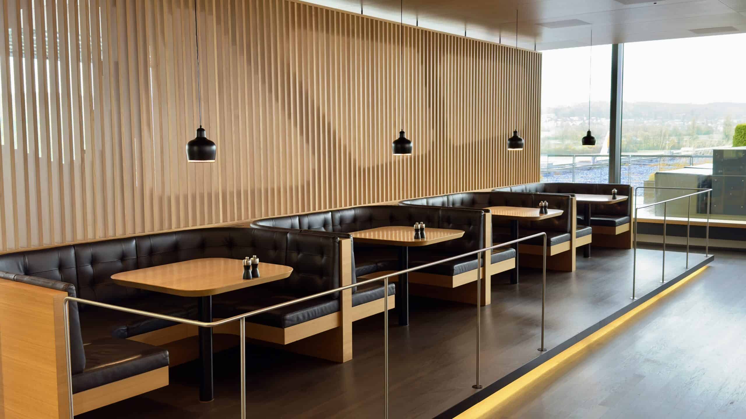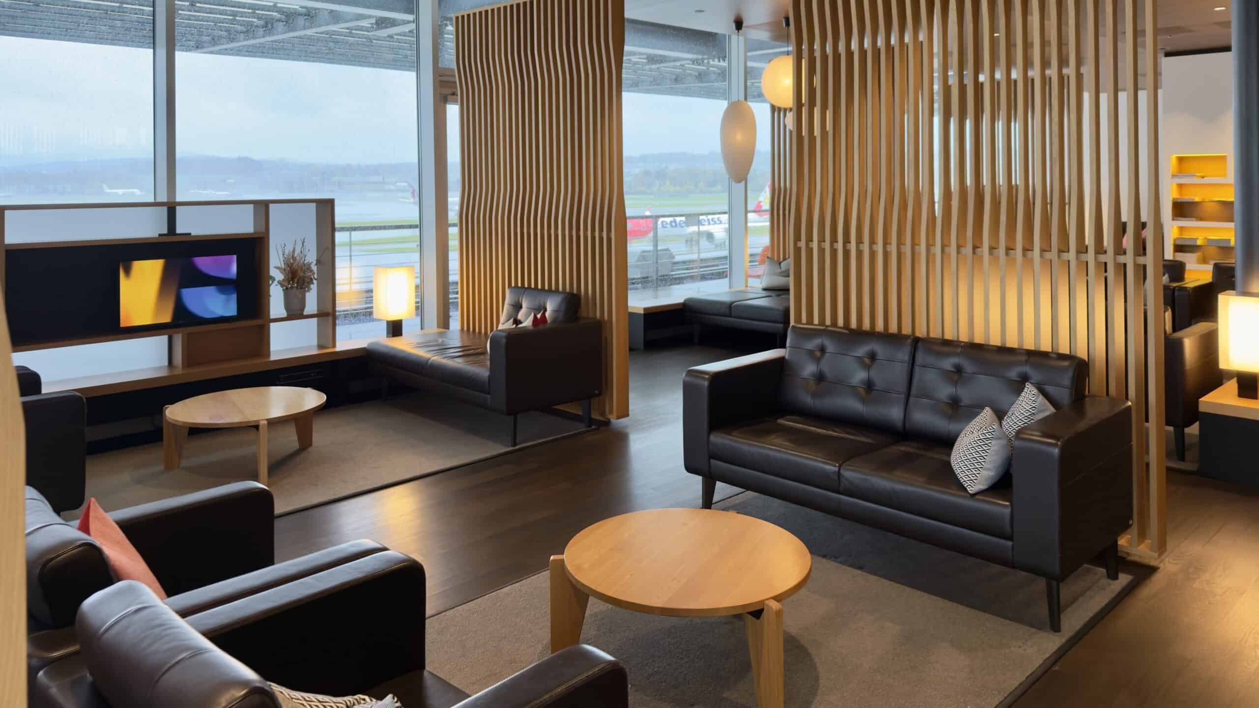 Auf der rechten Seite der Bar befinden sich verschiedenste Sitzmöglichkeiten, welche teilweise durch Holzpaneele ein Gefühl von Privatsphäre vermitteln sollen. Dabei wurde architektonisch jedoch darauf geachtet, dass genügend natürliches Licht in die Lounge gelangt. Dadurch hat man auch hier eine hervorragende Aussicht auf das Vorfeld.
