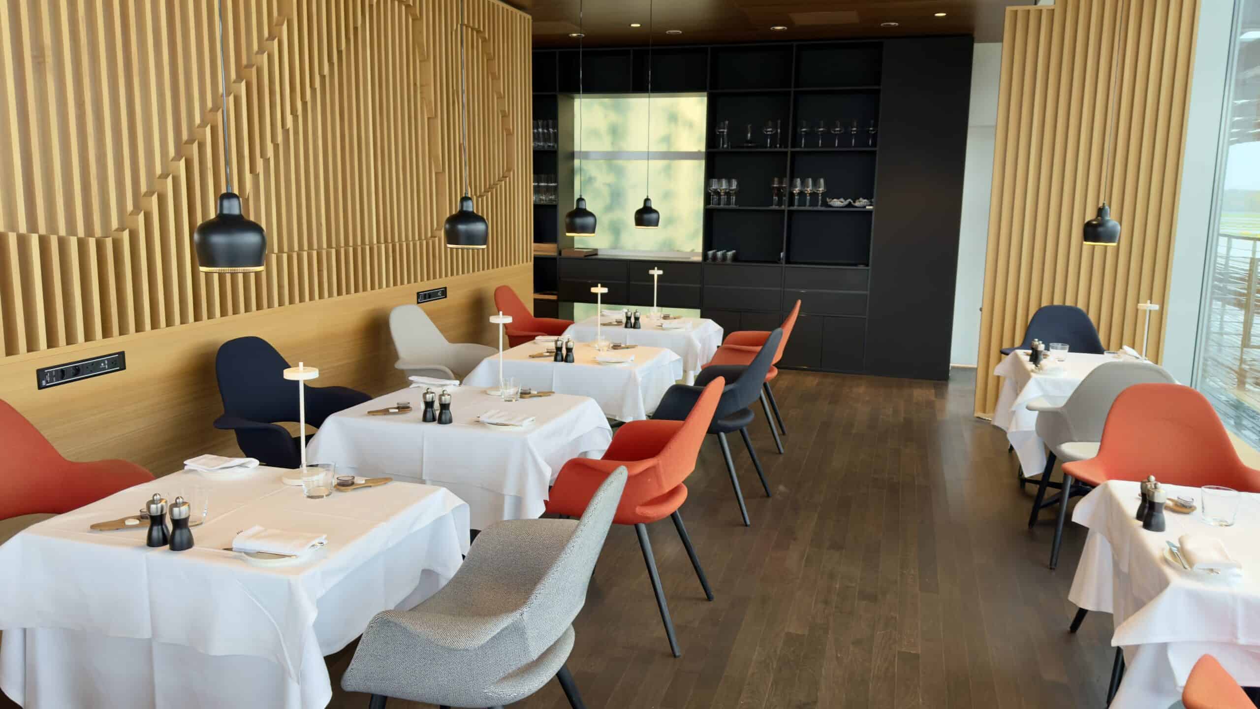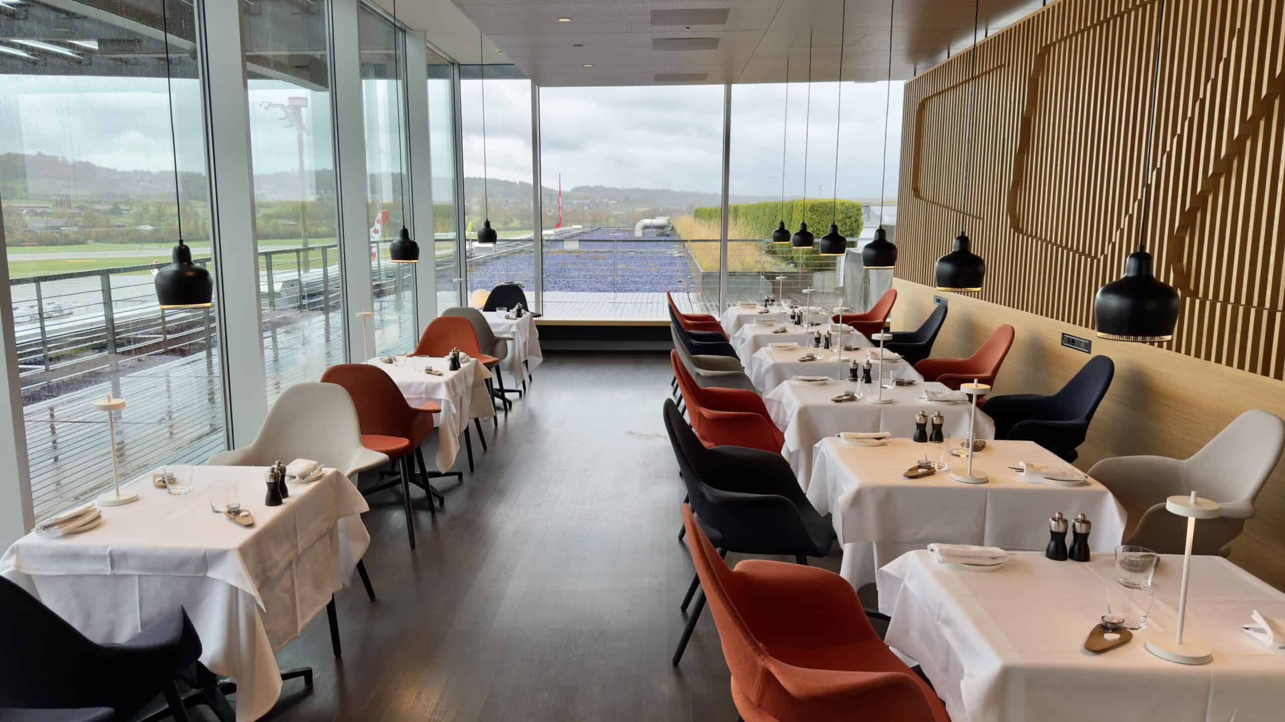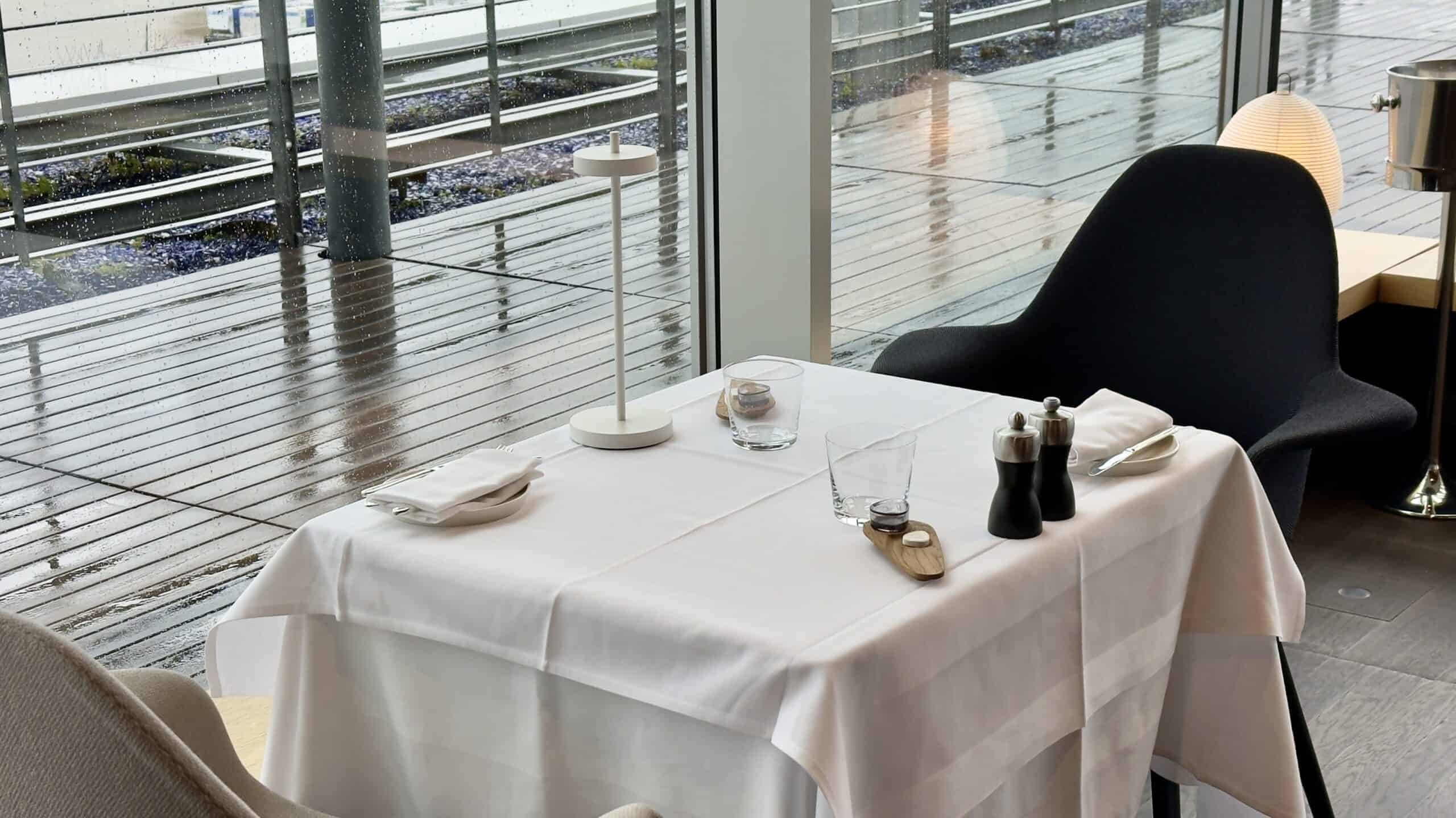 Die Lounge verfügt grob aufgeteilt über vier verschiedene Bereiche. Dem Restaurantbereich auf der linken Seite mit Blick auf die Startbahn 32/14 mit neun eingedeckten Tischen. Dieser Bereich gefällt mir ehrlicherweise am besten, da er am lichtdurchflutesten ist und es hier etwas zu essen gibt.