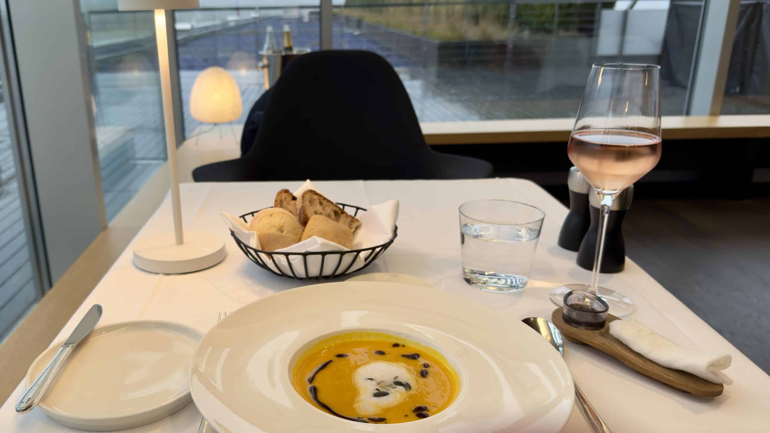 Meine zweite Essensrunde habe ich im Restaurantbereich zu mir genommen. Direkt nach dem Hinsetzen wurde Brot gereicht und das am Platz befindliche feuchte Tuch zum Quellen gebracht (dazu mehr im Bereich Service). Zu dem Brot orderte ich eine Kürbis-Ingwer-Suppe, welche sehr lecker schmeckte.