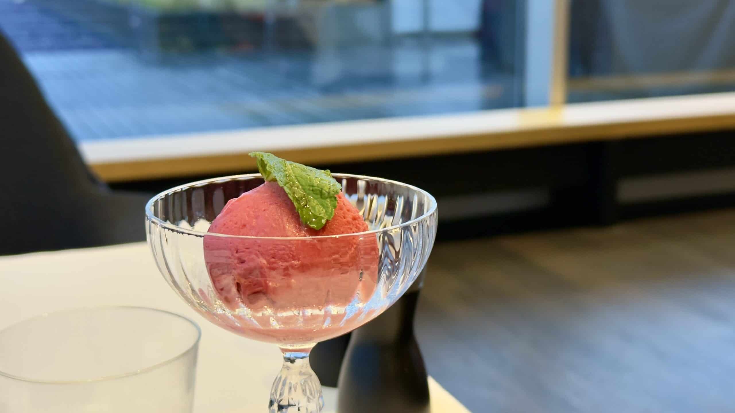 Als Dessert gab es „Schweizer Schoggimouse“ aus Lindt Schokolade mit Alpenrahm und hausgemachtem Himbeersorbet. Der Star dieses Ganges war dabei definitiv das Sorbet, wovon ich mir noch eine Portion extra orderte. Das Mousse war zwar nicht schlecht, wirkte jedoch auch hier wieder etwas einfach angerichtet.
