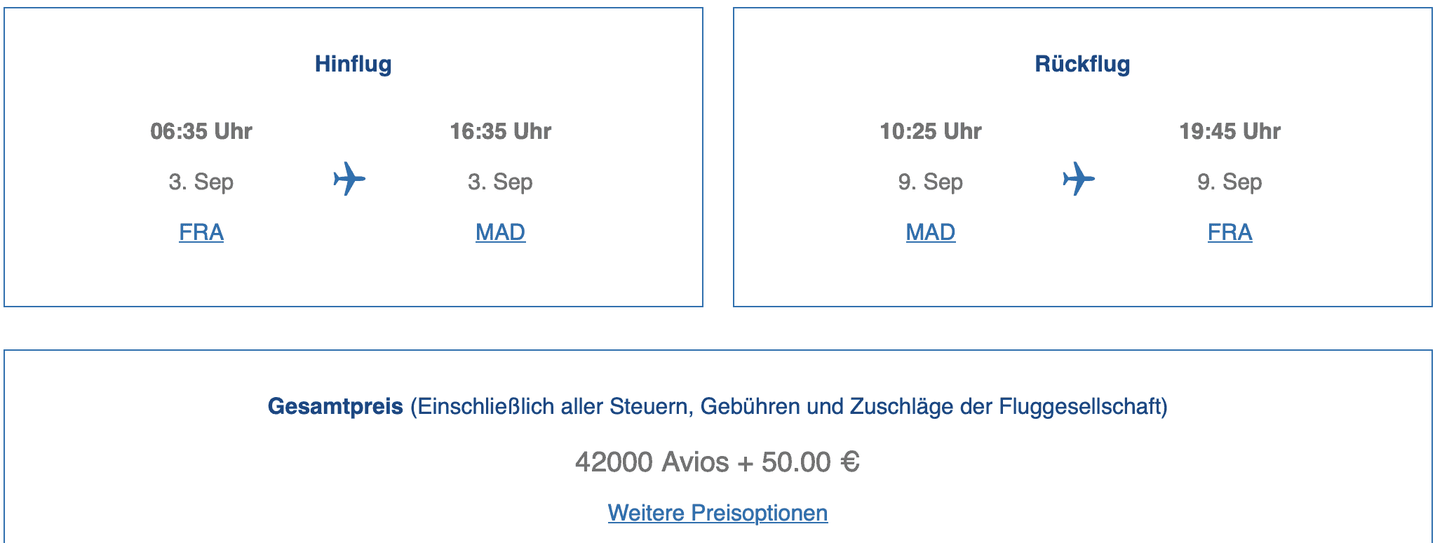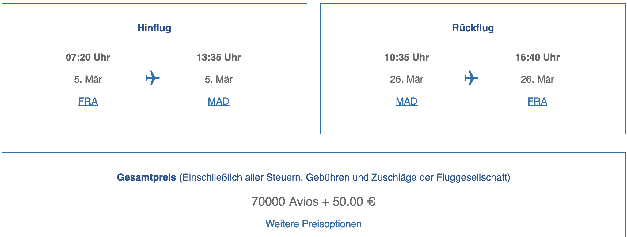 Es lassen sich zudem auch Flüge zwischen den verschiedenen Destinationen mit einander kombinieren. So kann man zum Beispiel auch von Frankfurt über London nach Madrid fliegen und profitiert von dem Rabatt für beide Strecken, da der British Airway Club die Segment einzeln bepreist.