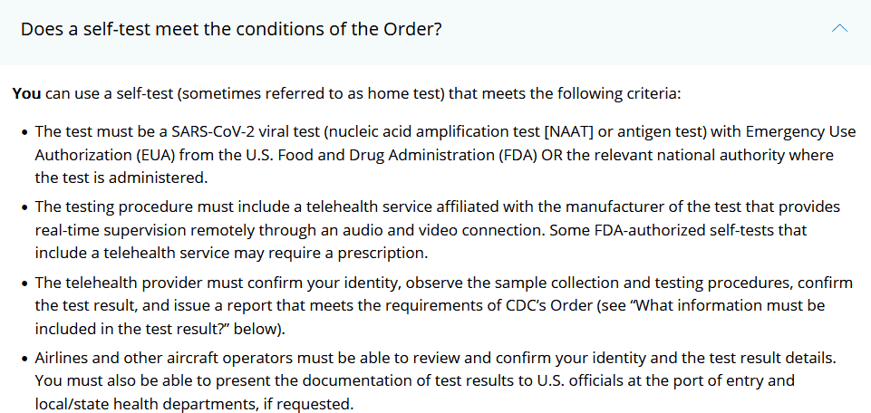 - Der Anbieter der Online-Verifizierung muss mit dem Hersteller der Corona-Tests in Verbindung stehen („affiliated“ sein). Die Überwachung des Tests muss in Echtzeit per Audio und Video erfolgen