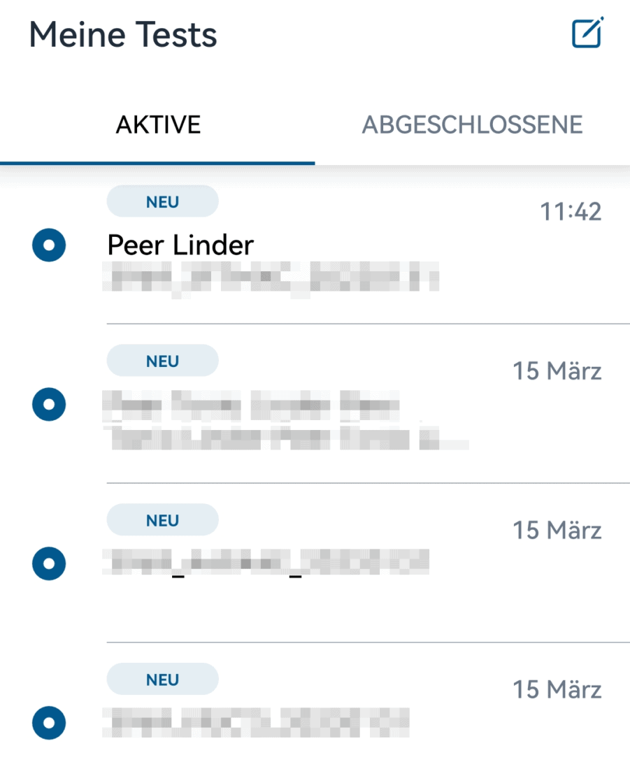 Wechselt in der App unten auf „Meine Tests“. Wenn alles gut läuft, sind eure zuvor gekauften Tests hier bereits alle aufgelistet und ihr könnt sie direkt nutzen: