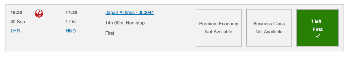 Die günstigste Möglichkeit, um mit Membership Rewards nach Japan bzw. Tokio in der First Class zu kommen, ist mit dem British Airways Club. Die japanische Airline fliegt in Europa drei Destinationen mit einer First Class an: London (mit der neuen First Class), Paris und Helsinki (beide mit der älteren First Class). Leider sind Verfügbarkeiten für Flüge mit Japan Airlines insgesamt recht selten, sodass man hier definitiv flexibel und teilweise auch spontan sein muss.