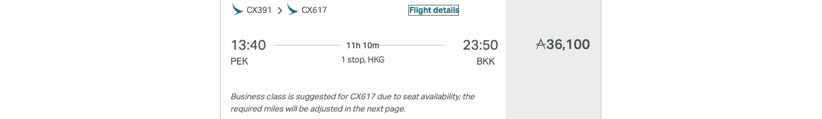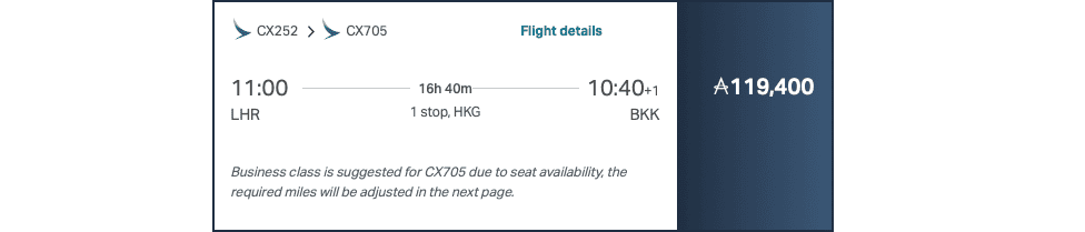 Insbesondere, da man durch Anschlussflüge mit Cathay Pacific innerhalb der Region und in der Business Class den Preis senken kann. So verrechnet Cathay die Strecke in der niedrigeren Reiseklasse prozentual zum Gesamtpreis, was eine Reduktion der benötigten Meilenmenge zur Folge hat. Wenn man nun nach einem First Class Langstreckenflug von Hongkong in der Business Class weiter nach Bangkok fliegt, reduziert sich der Preis somit auf 119.400 Meilen was 179.100 MR entspricht, bei gleichzeitig mehr Zeit im Flugzeug.