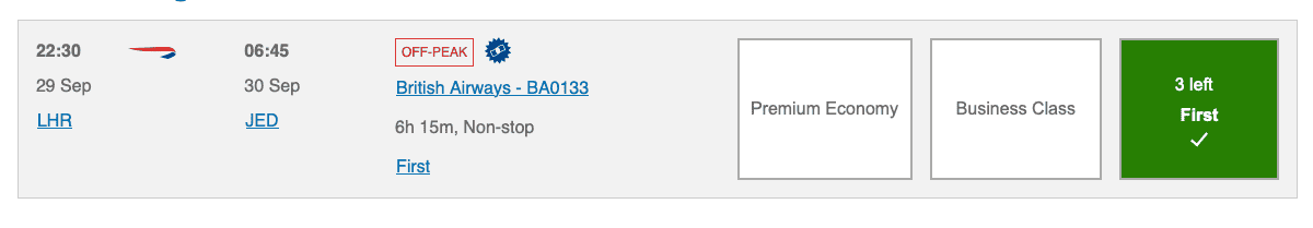 Wenn es einem darum geht, einmal First Class zu fliegen und das möglichst günstig, kann man auf den British Airways Club und First Class Flüge mit British Airways zurückgreifen. Ab London verbindet die britische Airline alle Kontinente auch in der First Class, sodass sich hier je nach MR-Konto und Vorliebe eine passende Verbindung finden lässt. Die günstigste Option sind Flüge von London in den Nahen Osten, nach beispielsweise Jeddah oder Abuja, da diese beiden Strecken noch knapp unter 3.000 Meilen Distanz liegen und somit nur 42.500 Avios (=53.125 MR) kosten. Dazu kommen ab London jeweils mindestens 585€, aus dem Ausland können die Zuzahlungen in Teilen auch geringer ausfallen.
