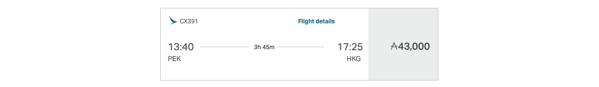 Ungünstigerweise veröffentlicht Cathay keinen Awardchart für Flüge mit der eigenen Airline. Ein Flug mit Cathay Pacific von London nach Hongkong kostet euch 125.000 Meilen (= 187.500 Membership Rewards Punkte) + ca. 3.500 HK$ (~383 €). Das ist definitiv nicht mehr so günstig, wie noch vor wenigen Jahren, kann aber trotzdem noch eine sinnvolle Option sein.