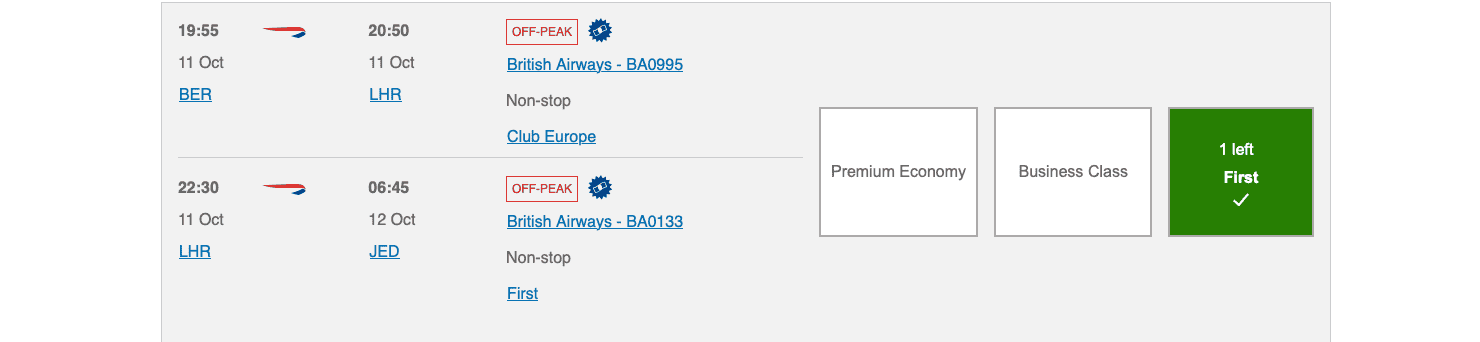 Mit dem Abflug ab z.B. Deutschland kann man die Zuzahlungen deutlich senken. Dafür kommen dann noch zusätzliche Avios für den Zubringer on top. So kann man für 57.500 Avios (= 71.875 MR) plus 293€ ab Berlin über London nach Jeddah fliegen. Bei 523€, sprich vergleichbar hohen Zuzahlungen zum Direktflug ab London fallen jedoch nur noch 43.650 Avios (= 54.563 MR) an. Grund dafür ist, dass für Tickets ab London noch die Air Passenger Duty fällig wird, welche bei Start im Ausland entfällt.