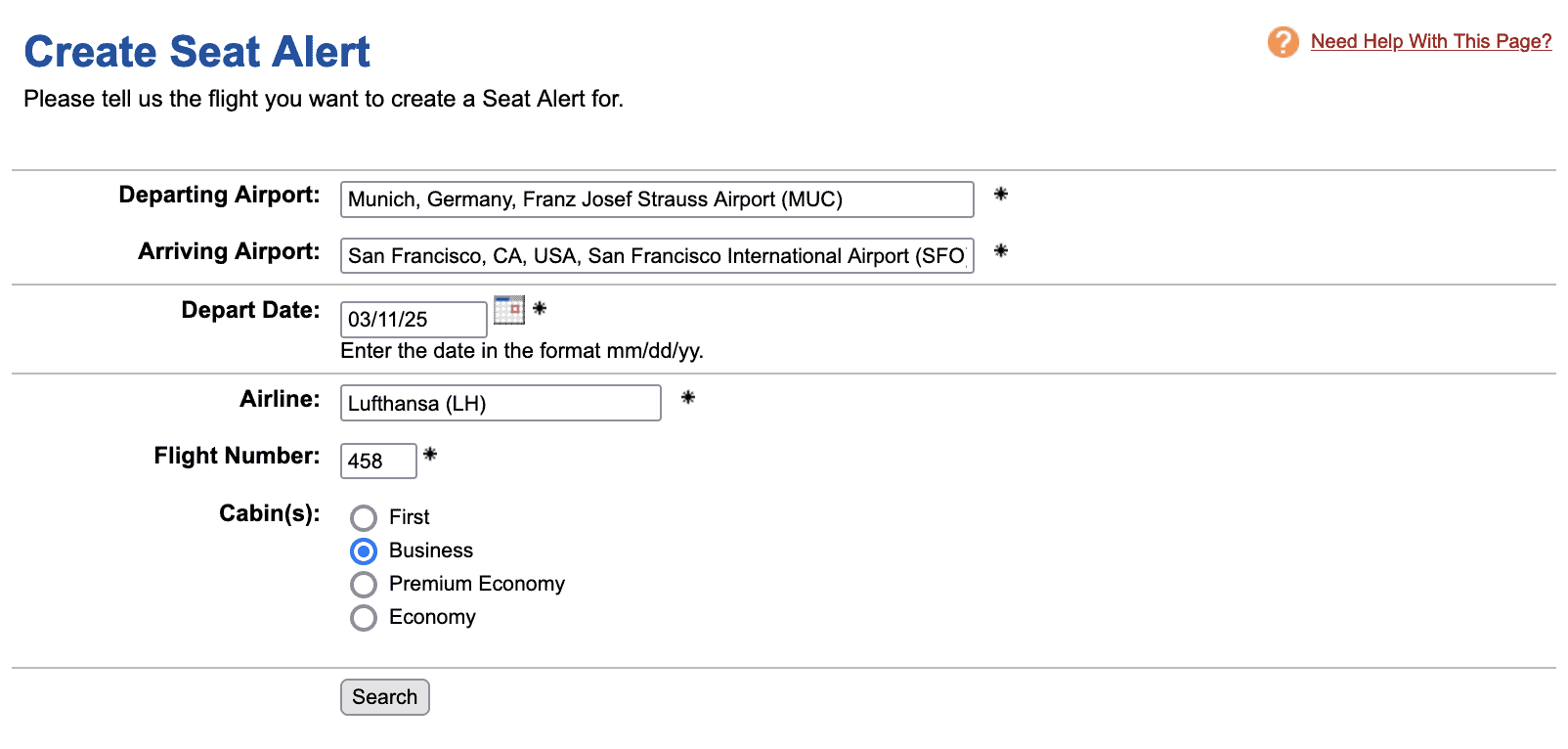 Anschließend müsst ihr den genauen Flug auswählen. Dazu müsst ihr den Departing und Arriving Airport angeben sowie das Depart Date, Airline, Flight Number und die Cabin: