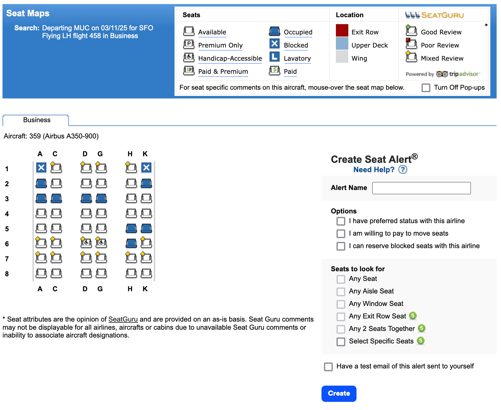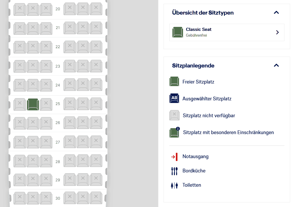 Die Legende erklärt euch die einzelnen Symbole. Weiße Sitzplätze sind aktuell frei und nicht geblockt. Alle blauen Sitzplätze sind entweder besetzt oder, wenn mit einem X versehen, geblockt. Dass auch geblockte Sitze angezeigt werden, ist ein großer Vorteil ggü. vieler Airline-Websites. Dort ist oft nicht erkennbar, ob ein Sitz tatsächlich belegt oder nur geblockt ist.