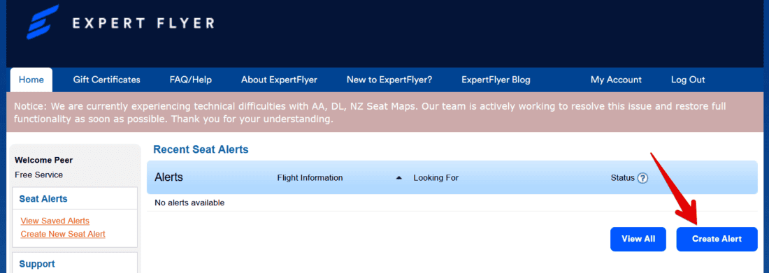 Dafür erstellt ihr euch zuerst ein kostenloses Account bei ExpertFlyer und loggt euch ein. Unter Seat Alerts klickt ihr auf Create Alert: