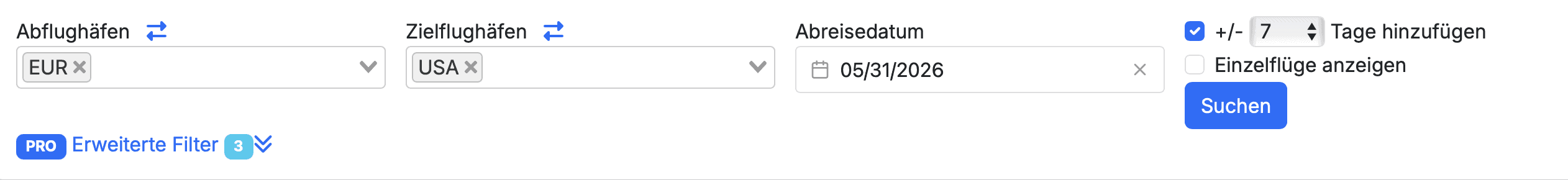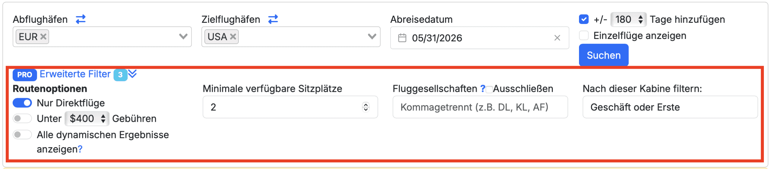 | Erweiterte Filter (Direktflüge, Reiseklasse, buchbare Sitze, ausgewählte Airlines u.v.m.) | ❌ | ✅ |