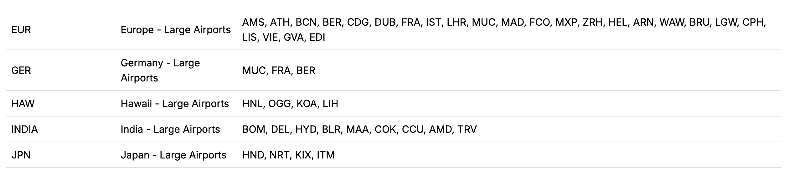 Die erste und scheinbar logischste Option zum Filtern ist die Eingabe der Strecke. Hier kann man jedoch nicht nur die gewünschten Flughäfen (es gehen auch mehrere Start- oder Zielflughäfen auf einmal), sondern auch für ausgewählte Regionen Areacodes eingeben. Dazu zählen z.B. EUR (für die größten europäischen Flughäfen), SAS (die größten südostasiatischen Flughäfen) oder USA (für die großen US-Flughäfen). Als Pro-User kann man zudem auch eigene Städtecodes erstellen.
