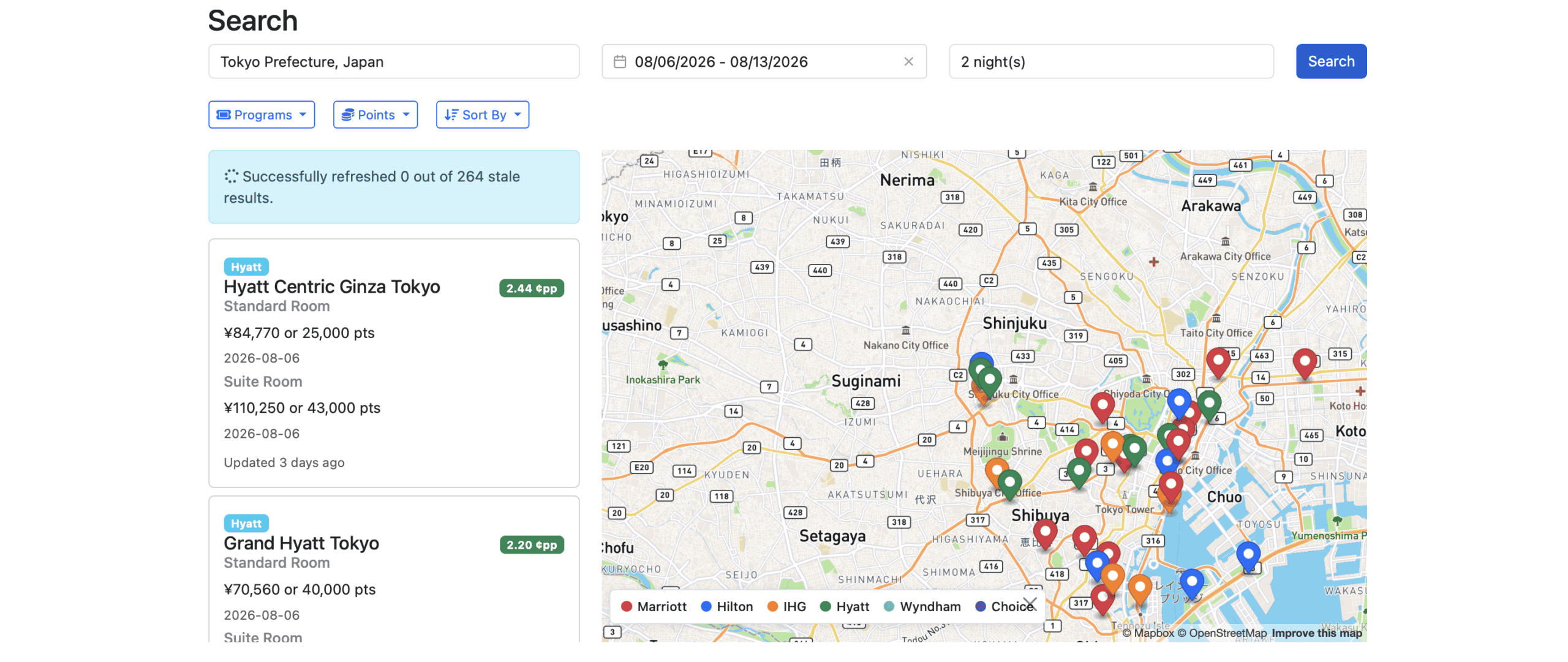 Das letzte nennenswerte Feature von seats.aero ist tatsächlich keines, welches etwas mit Flügen zu tun hat – mit rooms.aero hat seats.aero nämlich noch eine Verfügbarkeitssuche für Hotelnächte geschaffen. Gerade bei den teureren Hotels oder während größerer Events sind Verfügbarkeiten für Standardzimmer und bezahlbare Prämiennächte schwierig. Mit rooms.aero kann man sich Benachrichtigungen erstellen, um benachrichtigt zu werden, wenn wieder ein Zimmer frei ist. Zudem kann man sich hier einen Überblick über alle Hotels der großen Ketten in einer Stadt/Region verschaffen, ohne auf jeder der jeweiligen Seiten einzeln nachschauen zu müssen.