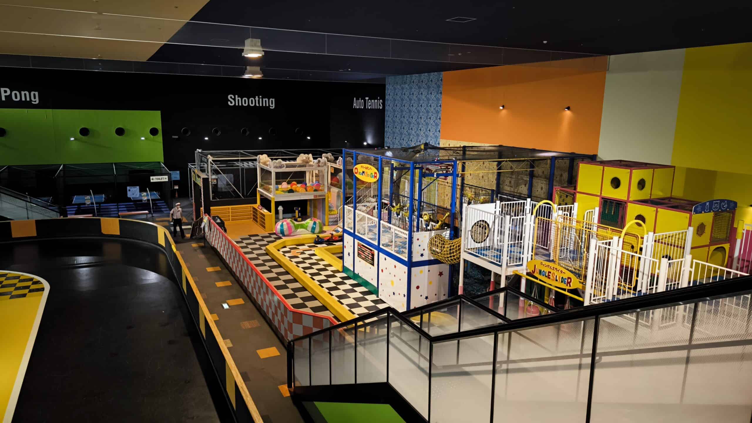 - Einen Kinder-Bereich mit Trampolinen, Bällebad, Rutsche usw.