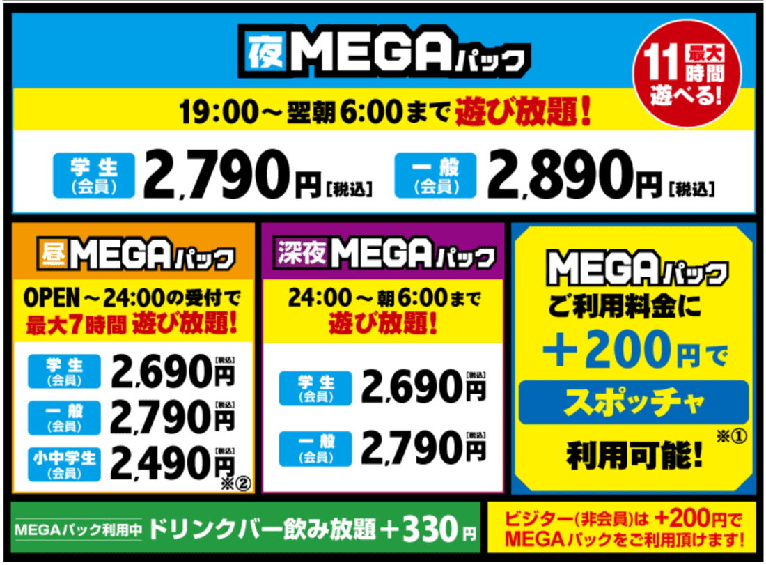 Die Preise schwanken geringfügig, je nach Filiale. Eine Preisübersicht für das Mega-Paket gibt es hier auf der Round1-Website. Meist kostet das MEGA-Bundle 2.900 Yen, dazu noch 200 Yen für den Zugang zum Spo-Cha-Bereich. Wer alles nutzen will, muss also mit etwa 3.100 ¥ (~18 €) pro Person rechnen. Der Preis gilt dann entweder von 19 bis 6 Uhr oder vom Zeitpunkt der Öffnung bis 19 / 24 Uhr (je nach Filiale).