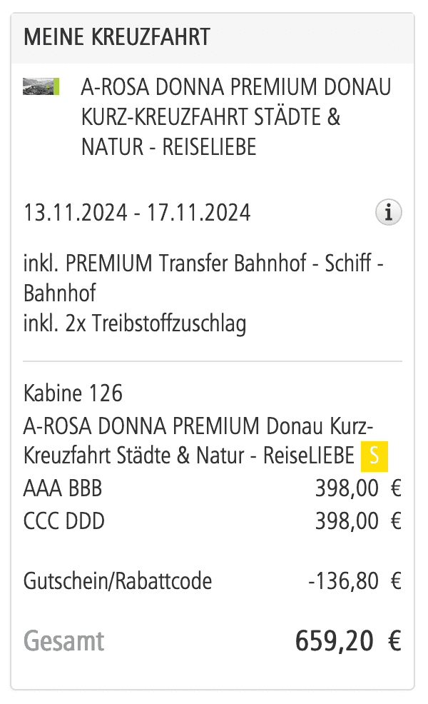 Ihr müsst im Buchungsprozess den Gutscheincode FINALE2024 eingeben, um auf u.g. Preise zu kommen. Damit erhaltet ihr einen Rabatt von 20% (exklusive Treibstoffzuschlag). Erfahrungsgemäß sind die günstigsten Kabinen nur in stark begrenzter Anzahl verfügbar und daher schnell ausgebucht. Ihr solltet also nicht zu lange mit der Buchung warten.