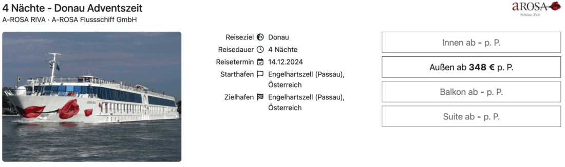 Bei A-Rosa, einem der größten Anbieter für Flusskreuzfahrten, sind in den vergangenen Tagen viele Reisen im Preis reduziert worden. Dadurch lassen sich nun auch zahlreiche Kreuzfahrten finden, die ihr für weniger als 100€ pro Person und Nacht (basierend auf einer Doppelbelegung der Kabine) buchen könnt.