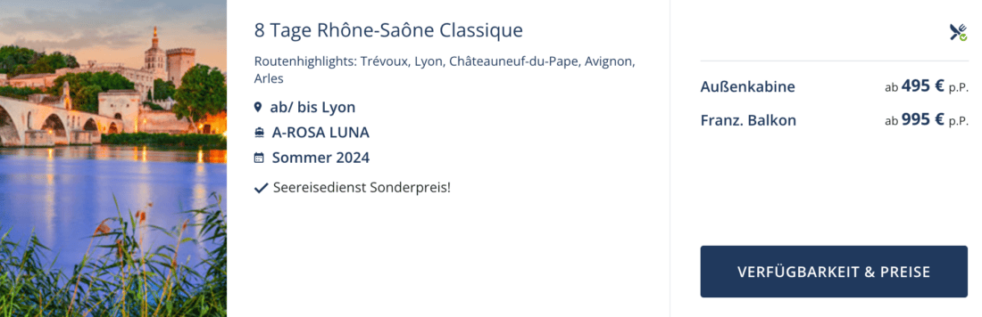 Beim Seereisedienst könnt ihr momentan eine Flusskreuzfahrt mit der A-Rosa Luna im August 2024 besonders günstig buchen. Dabei seid ihr ab Lyon für 7 Nächte auf den Flüssen Rhône und Saône unterwegs und könnt somit während der besten Reisezeit im Sommer die Region entdecken. Eine Außenkabine ist ab 495€ pro Person buchbar, für eine Kabine mit französischem Balkon werden 995€ pro Person fällig.