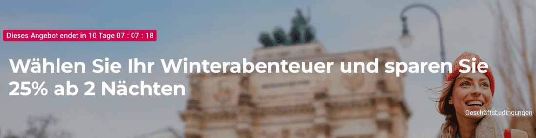 Falls ihr Mitglied im ALL-Bonusprogramm seid, werden also zunächst 10% als Mitgliederrabatt abgezogen und dann anschließend weitere 25% durch die Winteraktion. Bei Kombination der beiden Angebote ergibt sich somit ein maximaler Rabatt in Höhe von 32,5% bei Buchung einer flexiblen Rate.