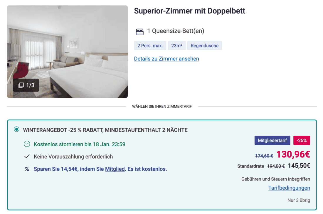 Das Angebot bezieht sich auf die flexible Rate (ggf. mit Frühstück), dort sind 25% Rabatt aber durchaus zu erreichen. Für die besten Preise könnt ihr euch zusätzlich für das Bonusprogramm anmelden, was aber kostenlos ist. Damit sind teilweise weitere 10% Rabatt möglich.