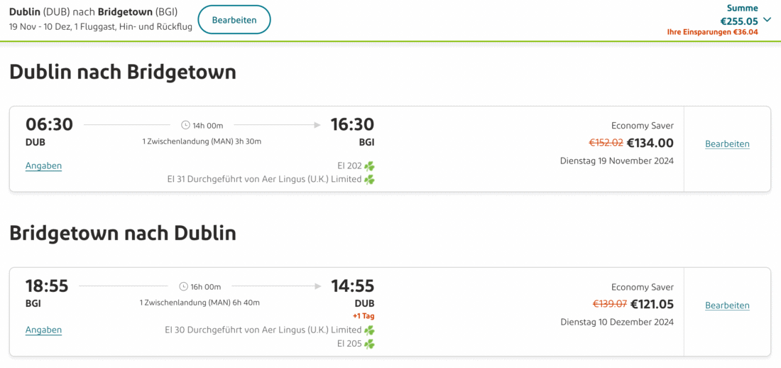 Hin- und Rückflüge von Deutschland nach Dublin gibt es mit Billigflieger Ryanair ab ca. 30€. Allerdings ist die Vorstellung, nur mit einem Personal Item nach Barbados zu fliegen, eher utopisch. Mit Personal Item (z.B. kleiner Rucksack) + 20 kg Aufgabegepäck landet ihr bei ca. 80 bis 100€.
