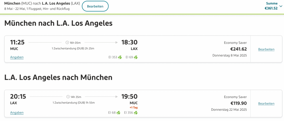 Bei Aer Lingus könnt ihr euch momentan günstige Tickets für Hin- und Rückflüge von München oder Zürich nach Los Angeles in Kalifornien bereits ab 362€ sichern. Dieser Preis beinhaltet 10 kg Handgepäck. Benötigt ihr für eure Reise in die USA Aufgabegepäck, so könnt ihr direkt bei Aer Lingus den Tarif Economy Smart ab 482€ buchen. Verfügbarkeiten gibt es für Reisen im Zeitraum von November 2024 bis Mai 2025 (ggf. geringe Abweichungen je nach Abflughafen).