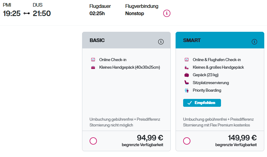 Wenn ihr euch lieber selbst Flüge buchen möchtet, müsst ihr ab Düsseldorf mit 145€ (ohne Gepäck) rechnen. Mit Aufgabegepäck seid ihr bei 250€. Selbstorganisierte Flüge lohnen sich also nur, wenn ihr wirklich kein Gepäck mitnehmen oder den Mallorca Aufenthalt zeitlich anpassen möchtet.