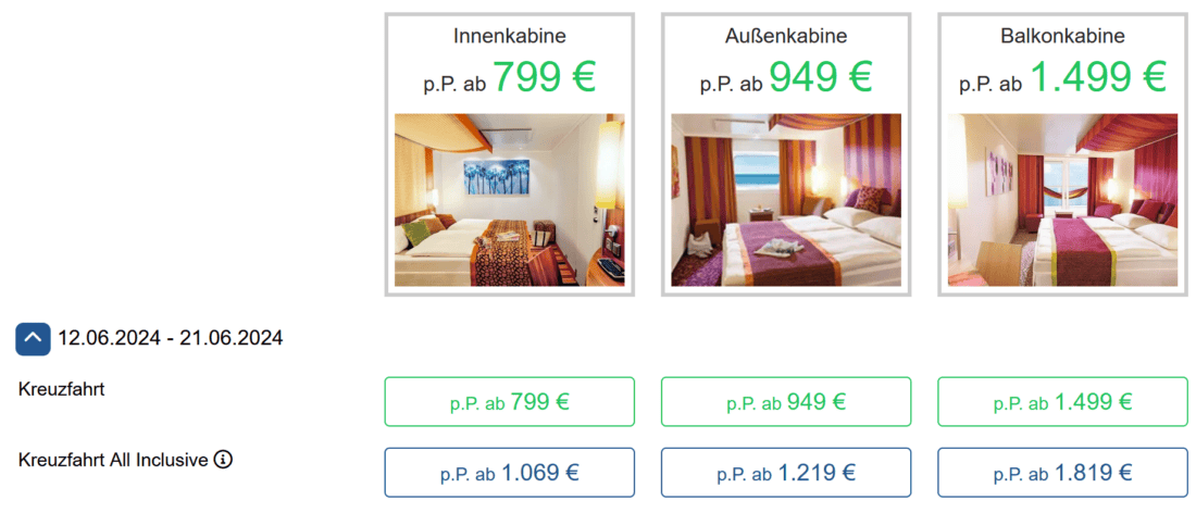 Mit Abfahrt am 12. Juni könnt ihr mit der AIDAmar von Warnemünde für 799€ pro Person nach Norwegen reisen. Die Kreuzfahrt dauert insgesamt 10 Tage und beinhaltet zusätzlich zu den Fjorden auch die Städte Bergen, Göteborg (Schweden) & Århus (Dänemark). Die Außenkabine ist für 949€ pro Person buchbar, die Balkonkabine für 1.499€ pro Person eher teuer. Für Alleinreisende ist diese Reise hier nicht buchbar.
