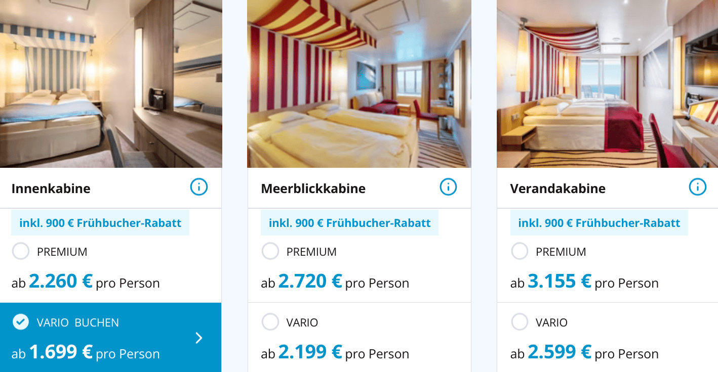Zusätzlich erhaltet ihr bei Buchung bis zum 4. Juni 2025 ein Bordguthaben in Höhe von 400€ pro Kabine. Bei Einzelbelegung wird die Hälfte des Guthabens gewährt, in diesem Fall also 200€.